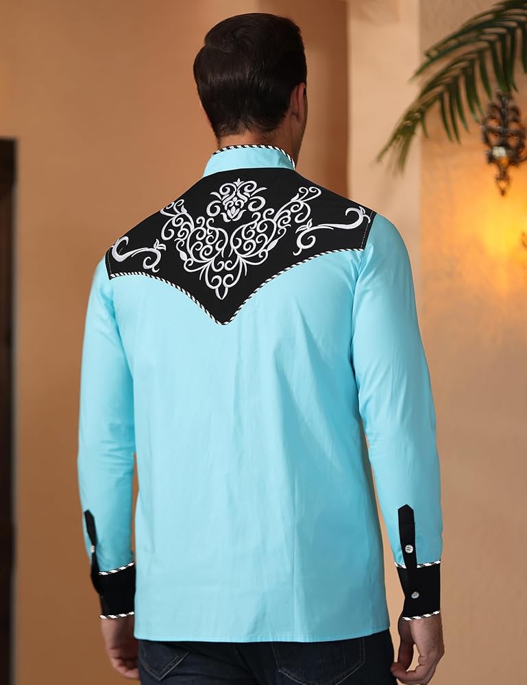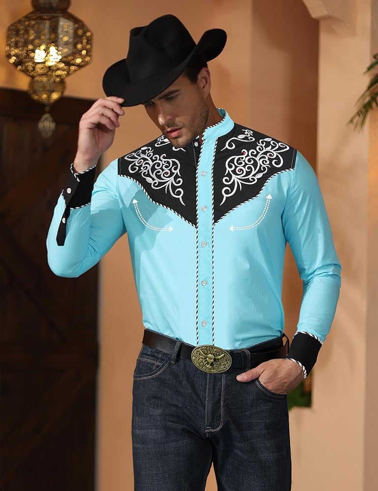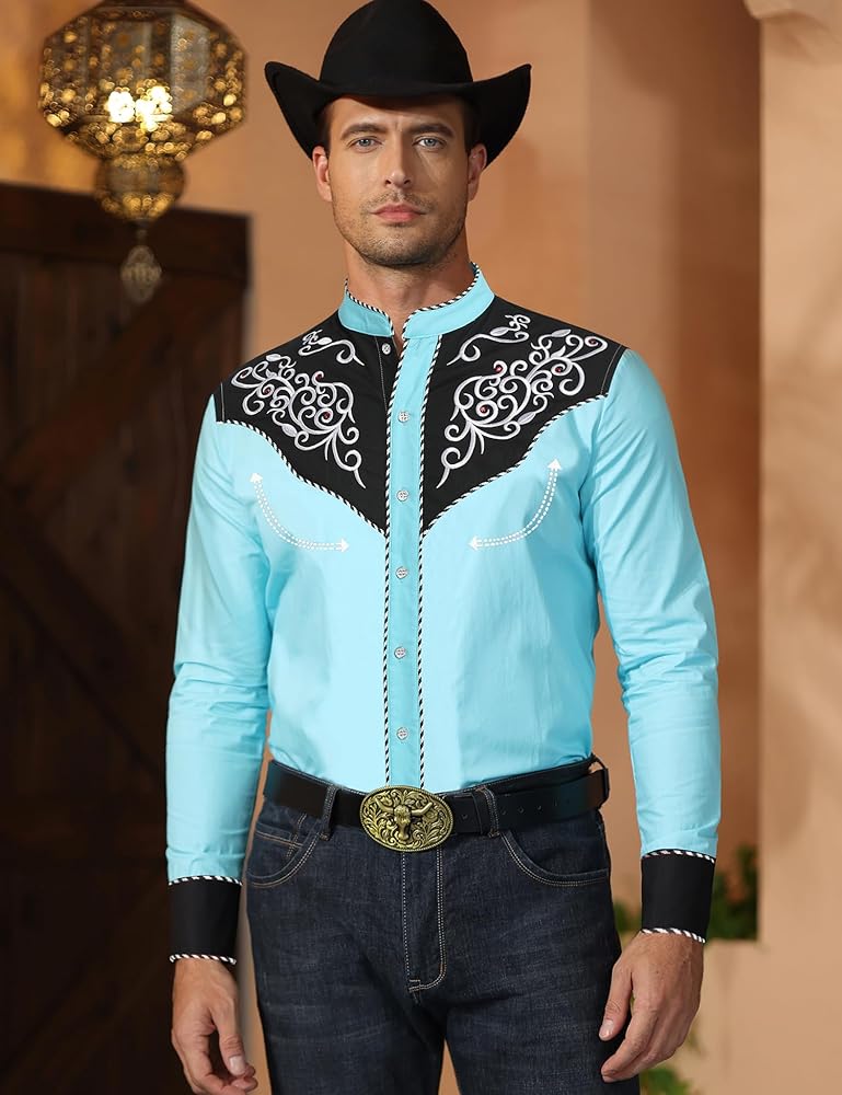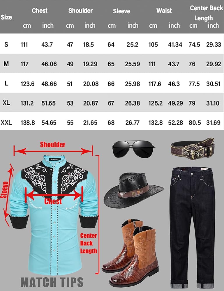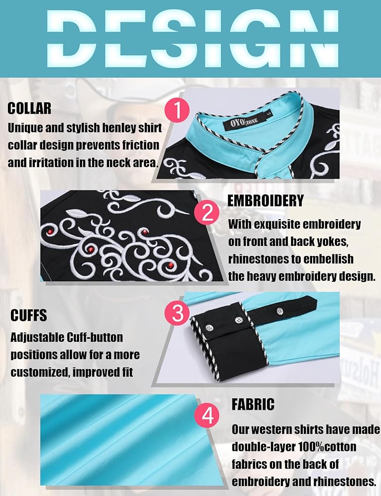 تصميم مطرز: يتميز زي رعاة البقر بمقاس كلاسيكي. يتميز قميصنا الرائع بتصميم فريد وأنيق بياقة قميص هينلي يمنع الاحتكاك والتهيج في منطقة الرقبة، مع تطريز رائع على الأربطة الأمامية والخلفية، وأحجار الراين لتزيين تصميم التطريز الثقيل، والأزرار إغلاق سفلي، وتصميم بدون جيب.