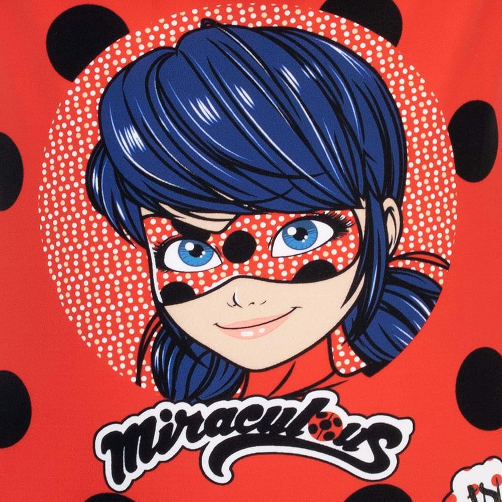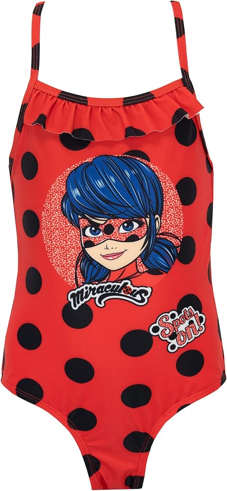 Girls Miraculous Ladybug Swimsuit. Dress your little superheroine for a holiday in the City of Paris in this magnificent Miraculous swimming costume! With Miraculous Ladybug's signature red and black polka dot print, a large print of Miraculous herself and the slogan 'Spots On', this bathing costume is perfect for those who adore her.