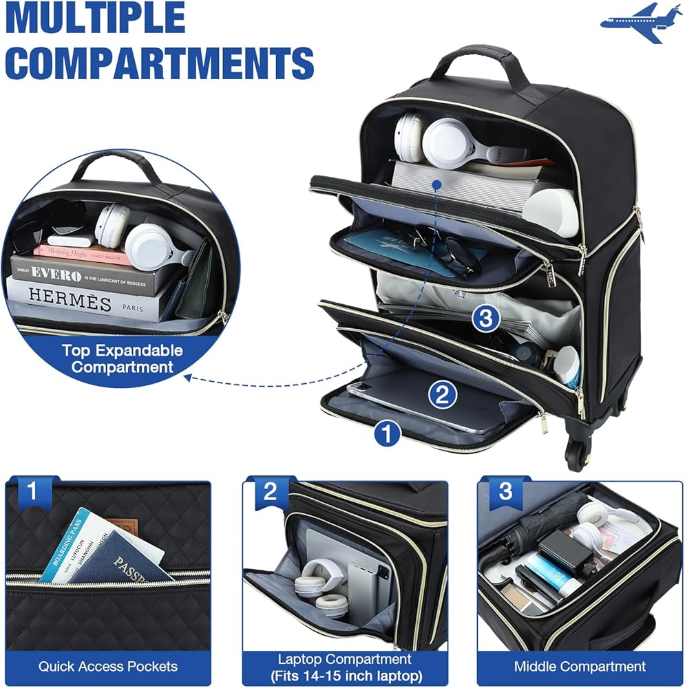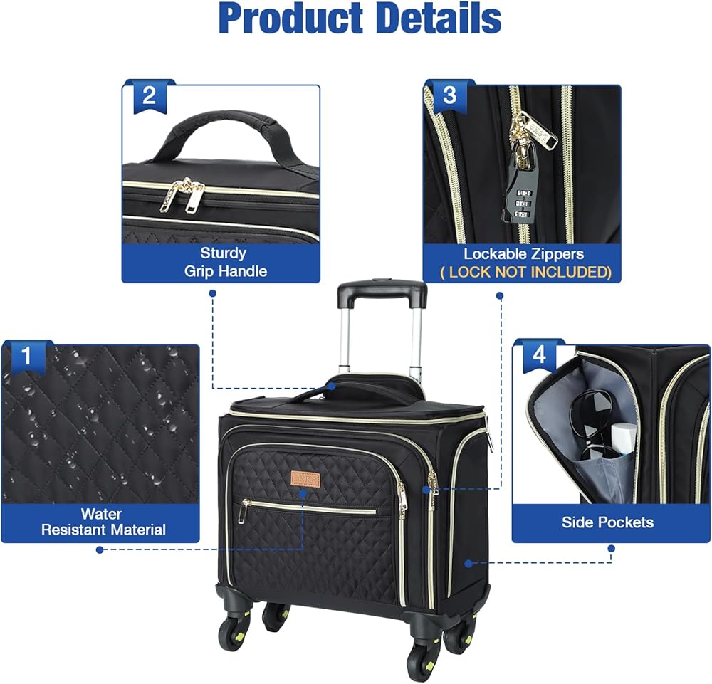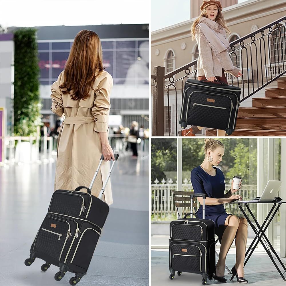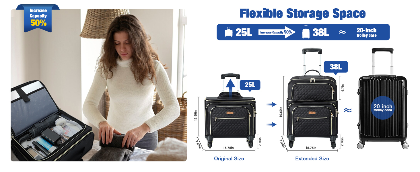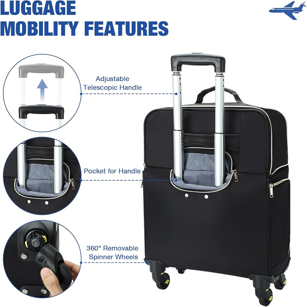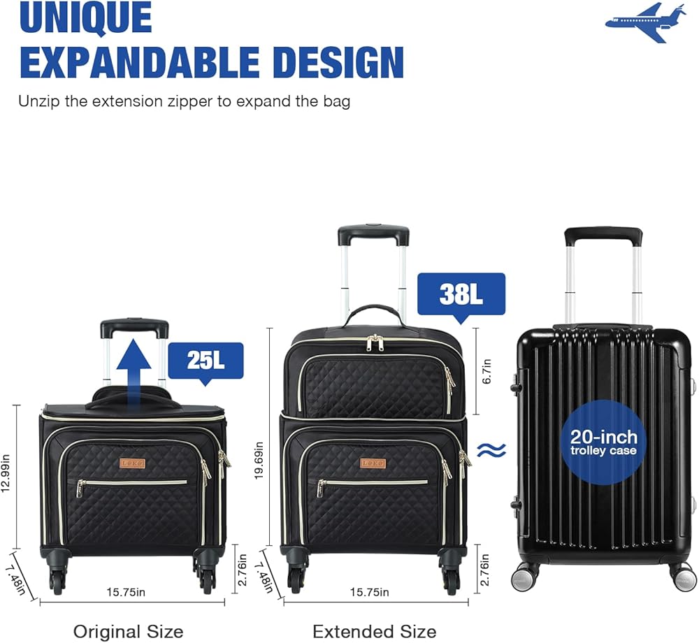 • مناسبة للطائرات: يبلغ مقاس حقيبة السفر الخاصة بنا للنساء 16.5 × 7.9 × 15.7 انش، مما يجعلها الحجم المثالي للأمتعة المحمولة، ويمكن وضعها بسهولة تحت مقاعد معظم شركات الطيران (قم بإزالة العجلات إذا لزم الأمر). يمكن أن تساعد الفتحة الكبيرة بزاوية 180 درجة في إجراء الفحوصات الأمنية بسرعة.