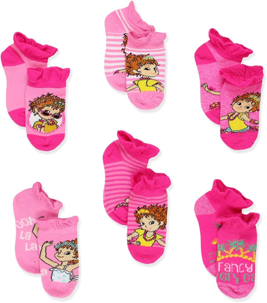 These Yankee Toy Box exclusive Fancy Nancy 6-pack toddler girls socks are perfect for your little one! Six pairs in each set provide variety and excitement with each pair featuring Disney's Fancy Nancy character: Fancy Nancy! Each pair of socks contains ruffle cuffs, reinforced heel and toes, and sublimated graphics. Choose from the beautiful no show style sock set, or the cute crew sock set! It's the perfect sock set for any fan of Fancy Nancy!