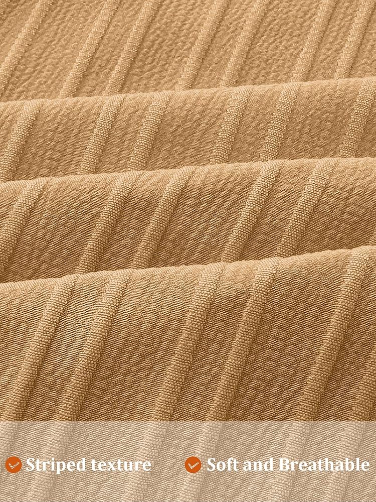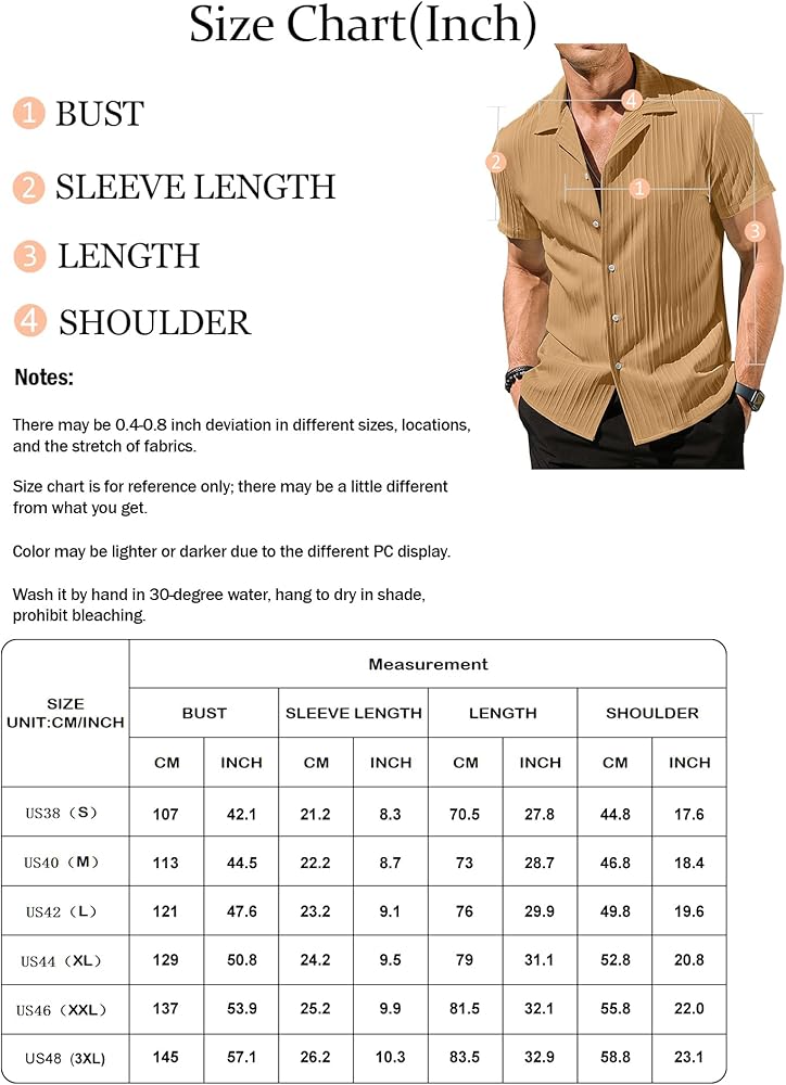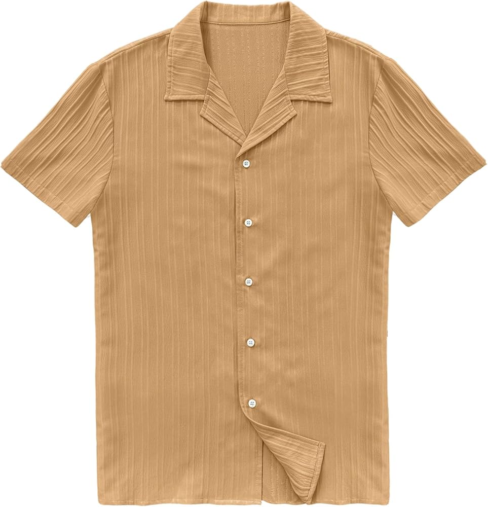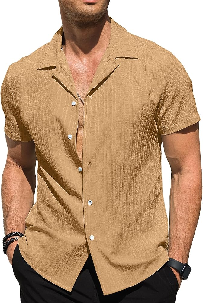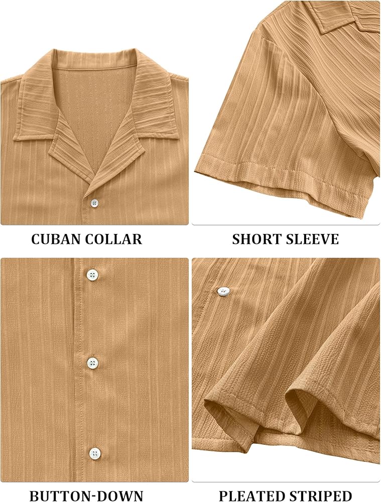 تصميم أنيق: يتميز القميص الرجالي بإغلاق بأزرار سفلية، وياقة كوبية، وأكمام قصيرة، وملمس مخطط عمودي ولون عادي، يجعلك تصبح أكثر وأكثر أناقة هذا الصيف.