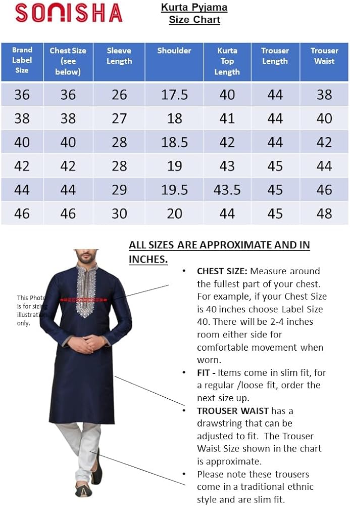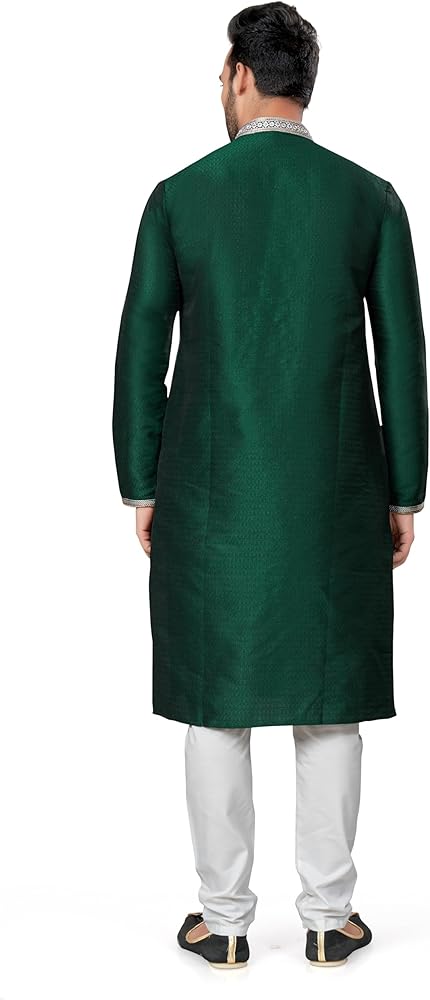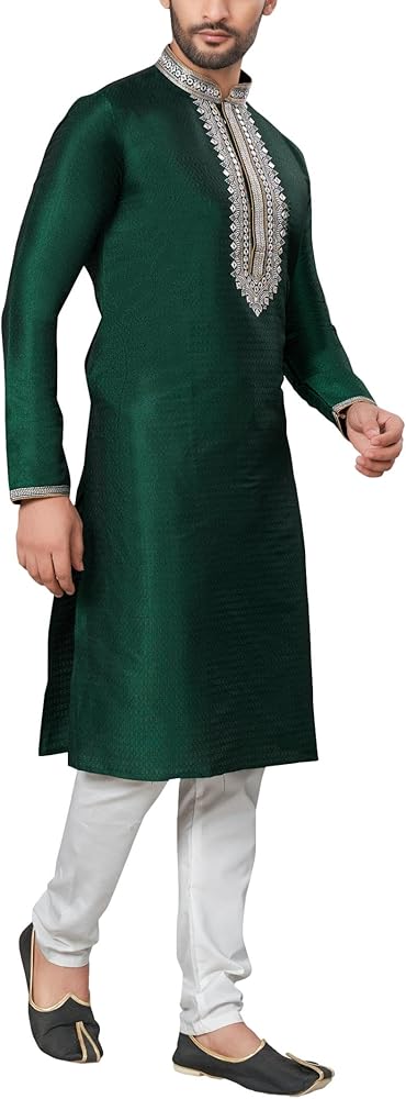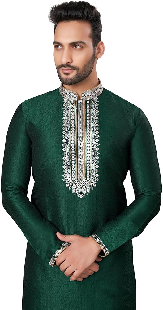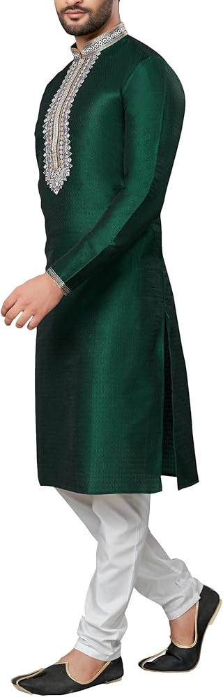 STYLISH AND ELEGANT: Striking 2 Kurta Pajama set, includes a top (Tunic / Kurta) and drawstring waist trousers (pajama). Brocade material and ivory thread and mirror (abla) embroidery adds elegance and sophisticaton. A hip and timeless kurta pajama; long knee length tunic, with a mandarin collar and long sleeves that is flattering in every size. QUALITY MATERIAL: Lightweight and breathable dupion art raw silk fabric gives this kurta pajama set an elegant look and soft, comfortable feel. SIZING & GARMENT CARE: The kurta is designed for a regular relaxed fit, in knee length with vented sides and 2 innovative side pockets. Please refer to the size chart (included in the image section) for further details. Dry clean only. Low iron if necessary. PERFECT GIFT: A unique and versatile gift that can be enjoyed at weddings, parties, festivals and carnivals. Give this kurta pajama set as a thoughtful present for Birthdays, Christmas, Father's Day, Eid, Diwali, Bollywood parties and many other celebrations. ALSO KNOWN AS: Men's Salwar Kurta, Men's Kurta, Kurta Pajama, Kurta Pathani, Kurta Tunic Pajama Set, Traditional Menswear, Sherwani, Wedding Kurta Pyjama and Bollywood Fancy Dress Costume.