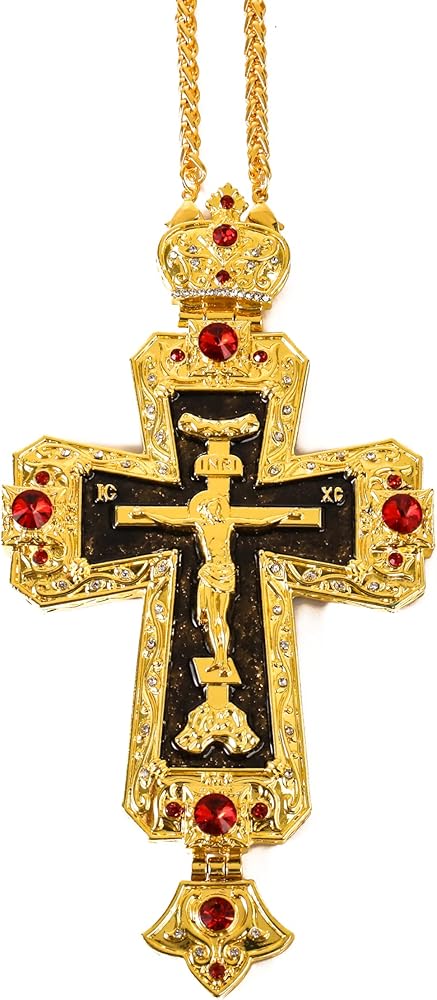 Gold-plated 18k Pectoral Cross with crystallized glass elements, With a Beautiful illustration of Jesus Christ. Beautiful handcrafted Cross on Iron base, plated in gold and silver to ensure durability and prevent corrosion tarnish. Cross pendant size (H X W): 16 cm x 7 cm / 6.3" x 2.7", Chain length: 60 cm / 23". Packed in a beautiful gift box with velvet base to provide extra protection. Christian priest bishop Cross can be hanged at home or used at Church. The Cross combined with a long 23" necklace hangs for the perfect wearing length. Spiritual gift relic Inspired by Christian bishops from around the world. Ideal for religious ceremonies or as a special present for Christ-followers, it is a heavily weighted, well-designed Cross that will surely fulfill your expectations.