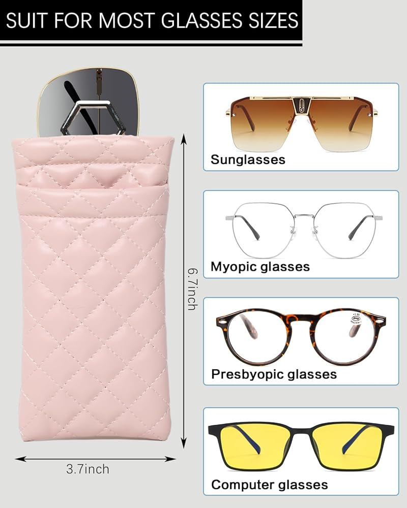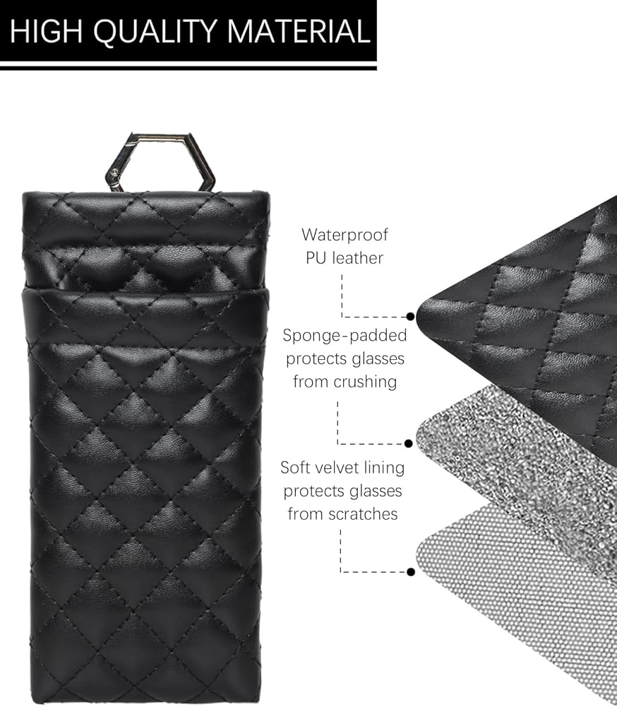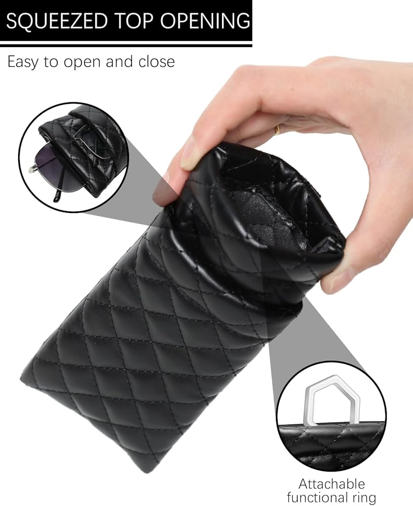 • حلقة تعليق معدنية مريحة: تشتمل حافظات النظارات الناعمة للنساء على تصميم شبكي عصري على شكل ألماس، مع ملمس ناعم وخطوط واضحة ومليئة بالملمس الراقي. إنه ملحقك المثالي. أضفنا حلقة تعليق معدنية لامعة على الجزء الخلفي من حقيبة تخزين النظارات الشمسية، حتى تتمكن من تعليق حقيبة النظارات على حقيبتك أو ملابسك.
