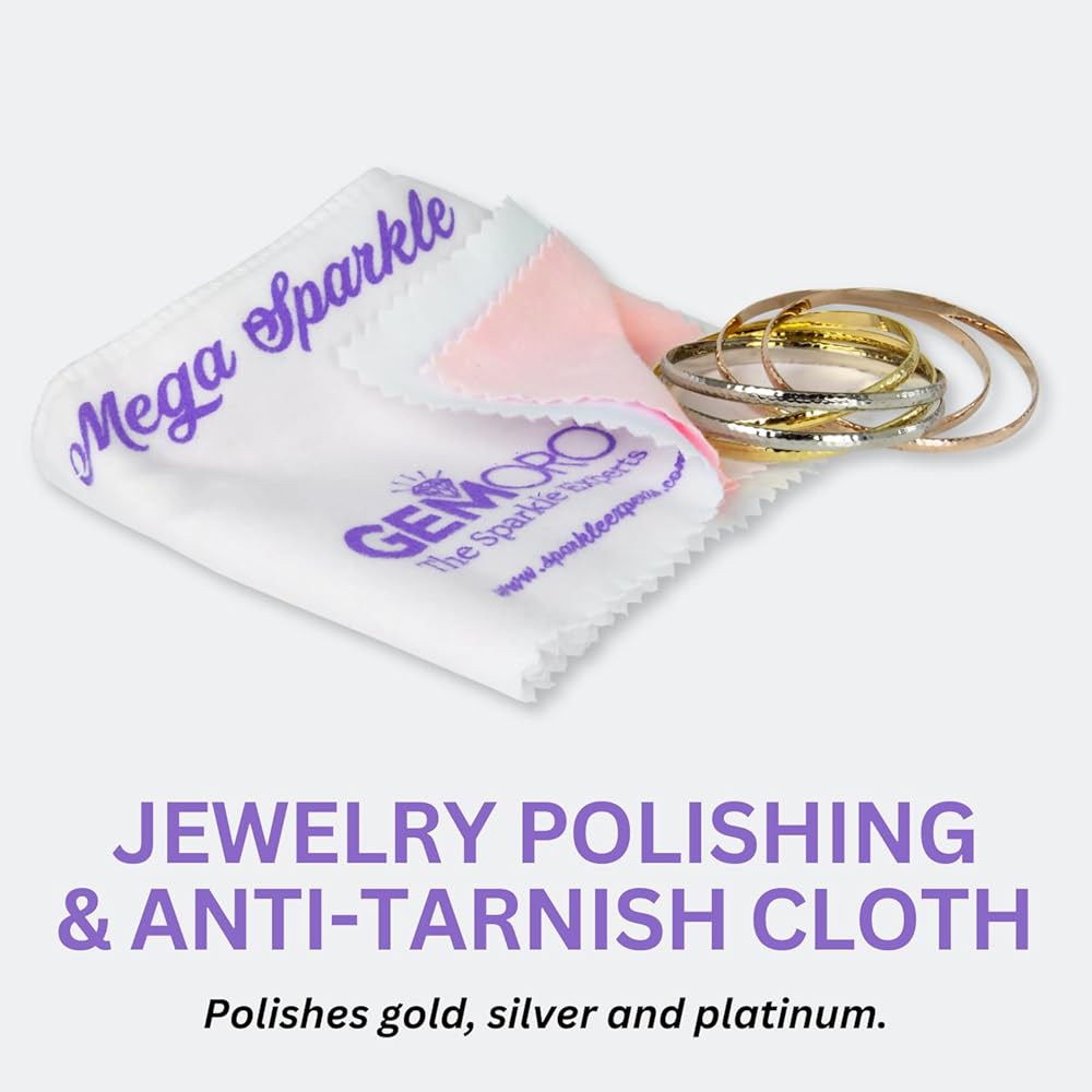 RESTORE: Restore your jewelry to its original brilliance with the GemOro Mega Sparkle Jewelry Polishing & Anti-Tarnish Cloth. This specially formulated cloth quickly and easily removes tarnish, and fingerprints from gold, silver, and platinum jewelry, leaving it sparkling like new. The Mega Sparkle cloth is made with a unique blend of polishing compounds and anti-tarnish agents that work together to break down tarnish and leave a protective barrier that helps prevent it from returning.