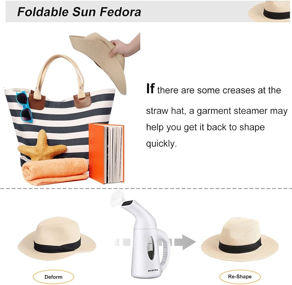 قابلة للطي والحمل: قبعة القش الخاصة بنا خفيفة للغاية ولها حجم مناسب يمكن طيها بسهولة في حقيبة يدك أو حقيبة اليد أو حقيبة السفر، لا تقلق بشأن مشكلة التخزين. نصائح: إذا كان هناك بعض التجاعيد بعد الضغط طويل الأمد، يمكنك فقط تبخير قبعة فيدورا الماصة للنساء قليلاً، ثم ستعود شكلها بسرعة.