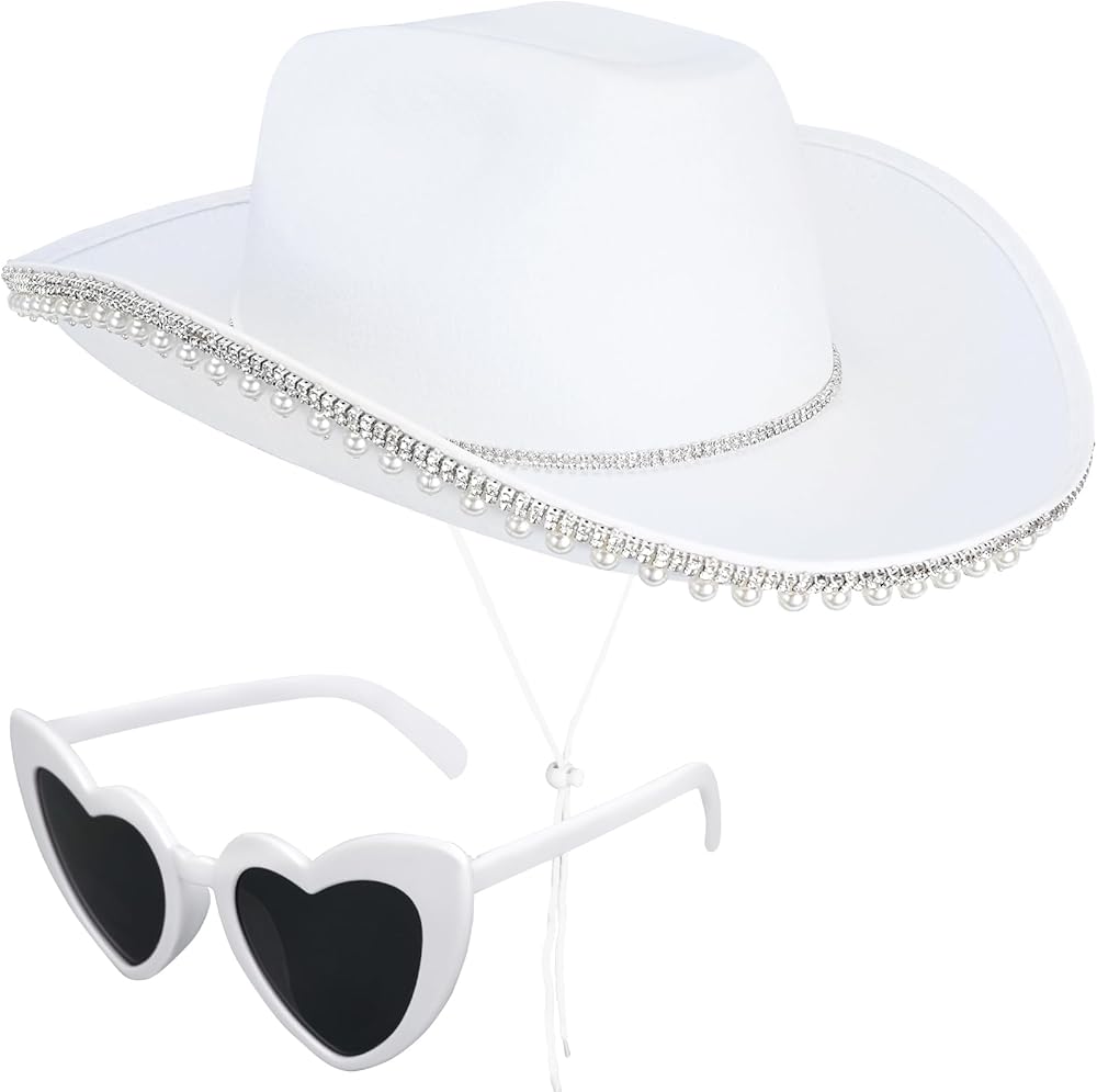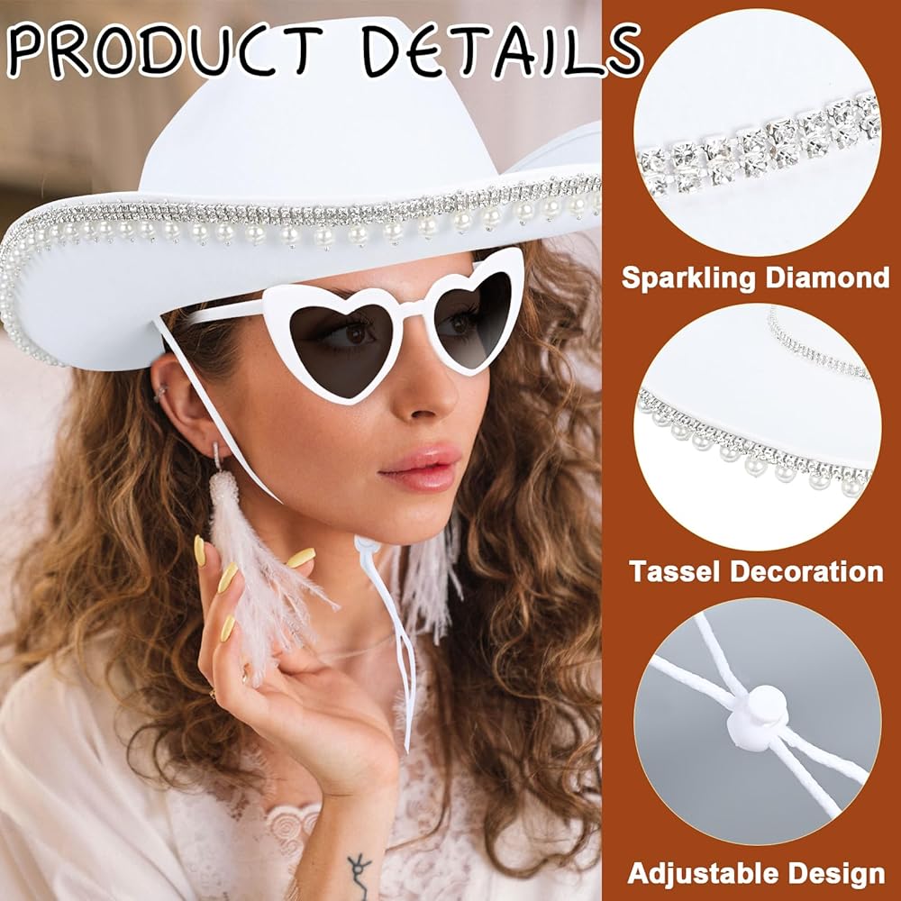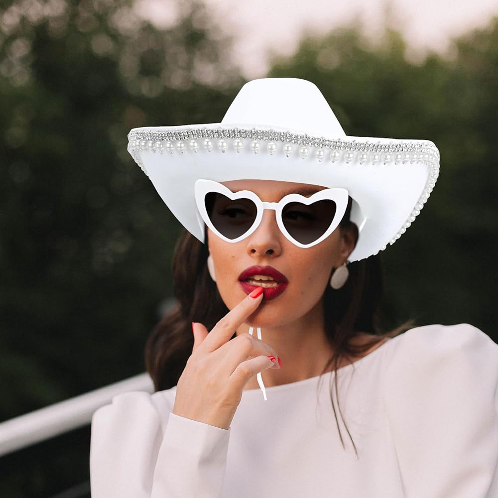 قبعة رعاة البقر باللؤلؤ من حجر الراين Yoiemivy للنساء - قبعة رعاة البقر الغربية مع نظارة شمسية على شكل قلب - قبعة راعية البقر البيضاء للعروس وأزياء حفلات توديع العزوبية - تغليف صندوق (أبيض)