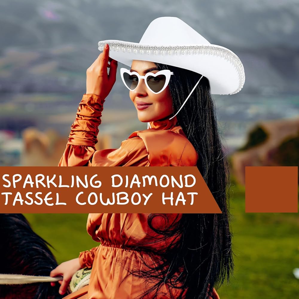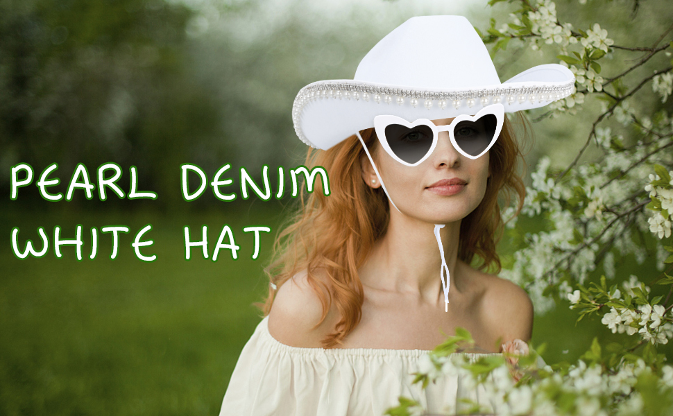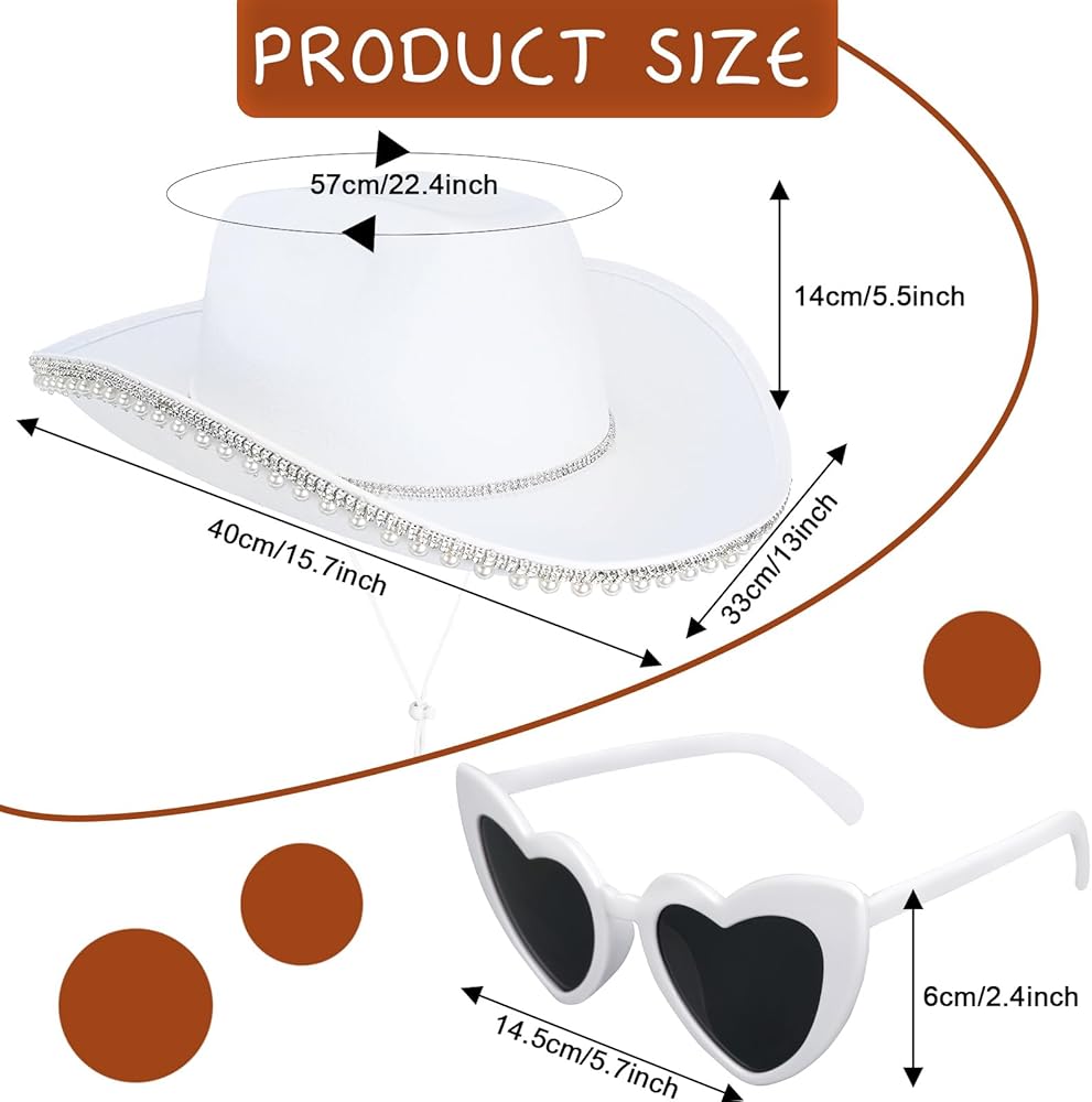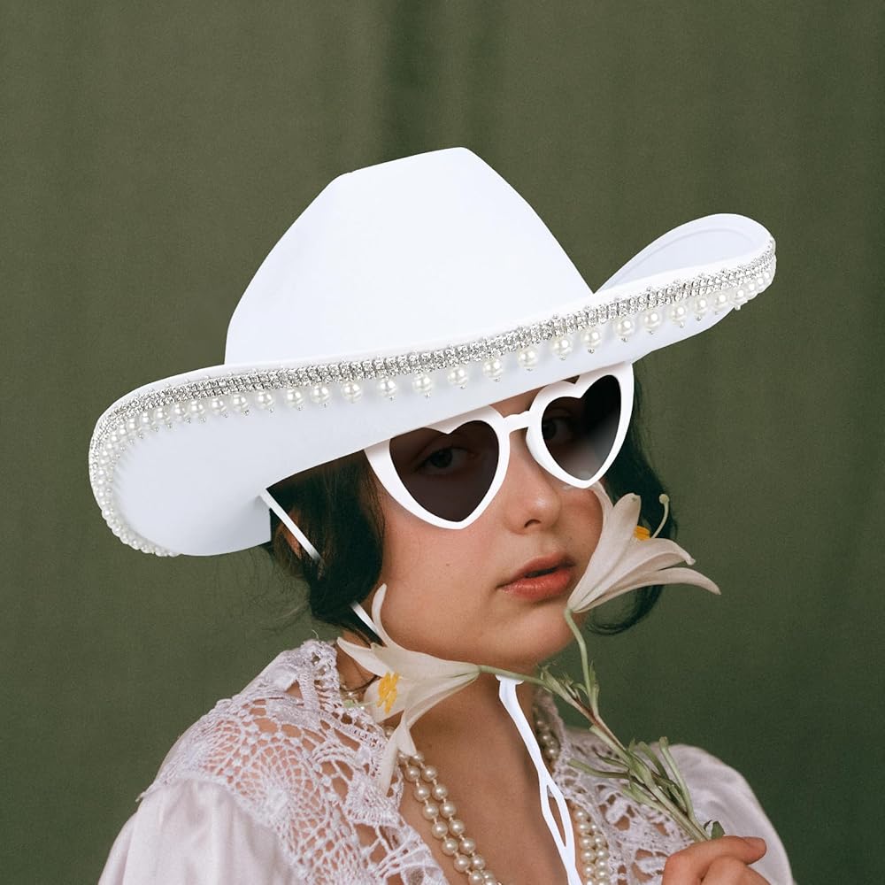 قبعة رعاة البقر باللؤلؤ من حجر الراين Yoiemivy للنساء - قبعة رعاة البقر الغربية مع نظارة شمسية على شكل قلب - قبعة راعية البقر البيضاء للعروس وأزياء حفلات توديع العزوبية - تغليف صندوق (أبيض)