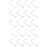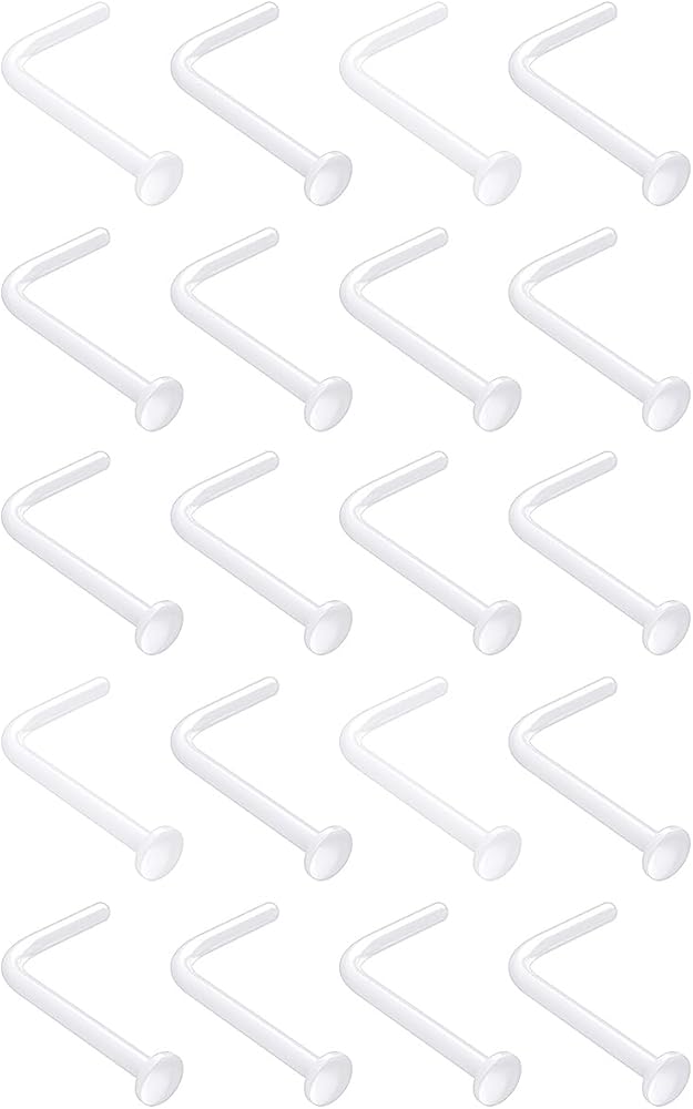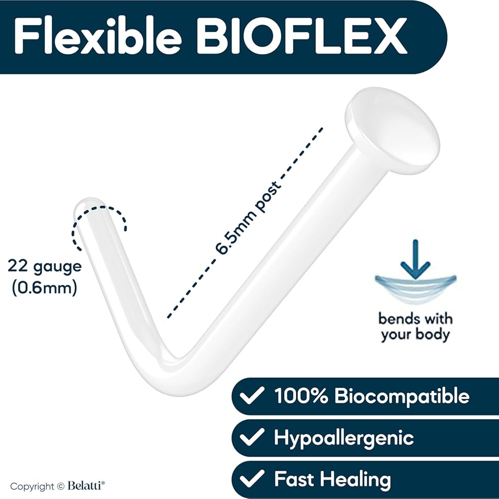 مسامير أنف شفافة على شكل حرف L من Bioflex، مثالية للثقوب المضادة للحساسية. خالية من المعادن والرصاص والنيكل وسهلة التنظيف.
