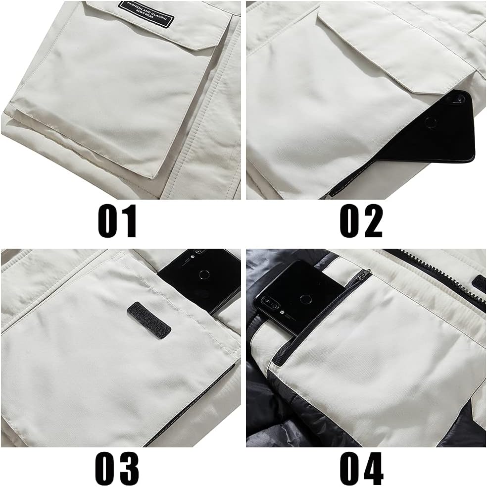 جيوب متعددة: جيبان بغطاء مع تصميم جيبين جانبيين بسحاب، وجيب داخلي واحد، وجيب ذراع مزخرف، يمكنه تخزين بعض الأشياء الصغيرة، مثل الهاتف، والمفاتيح، والمحفظة وما إلى ذلك. كما أنه يمكن أن يحافظ على دفء يدك.