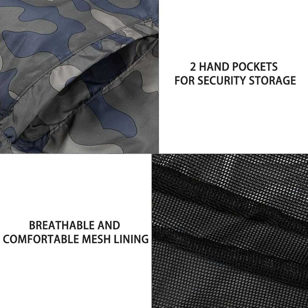 الهيكل: معطف المطر الرجالي ذو الحجم الكبير هذا مع غطاء للرأس يحتوي على غلاف بوليستر ناعم بنسبة 100% وبطانة شبكية مسامية. توفر معاطف المطر للرجال تهوية ممتازة، وشعورًا لطيفًا على البشرة، وتنقل الرطوبة بسرعة بعيدًا لتبقيك مرتاحًا في الأيام الممطرة.