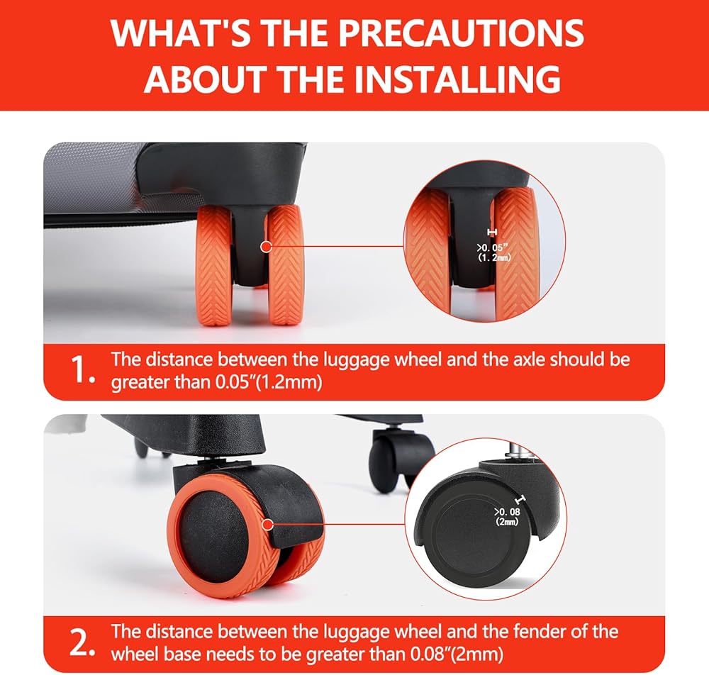 【سُمك ومتانة معززة】تم ترقية أغطية واقي عجلات حقيبة السفر الخاصة بنا بسُمك متزايد للحصول على متانة أفضل، مما يضمن ملاءمة مثالية لعجلاتك. أغطية استبدال عجلات الأمتعة هذه غير لاصقة. يمكنك بسهولة تثبيتها وإلغاء تثبيتها عدة مرات حسب الحاجة.