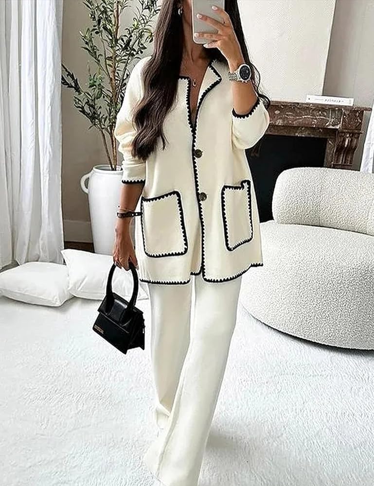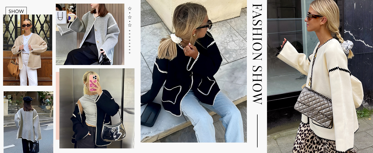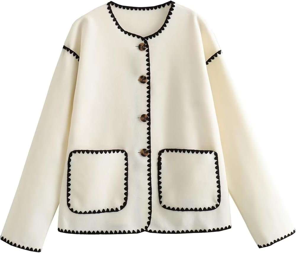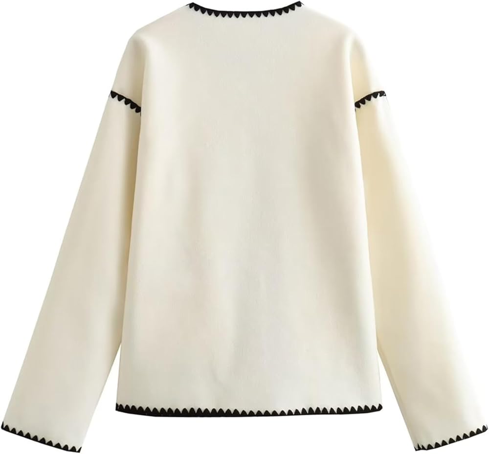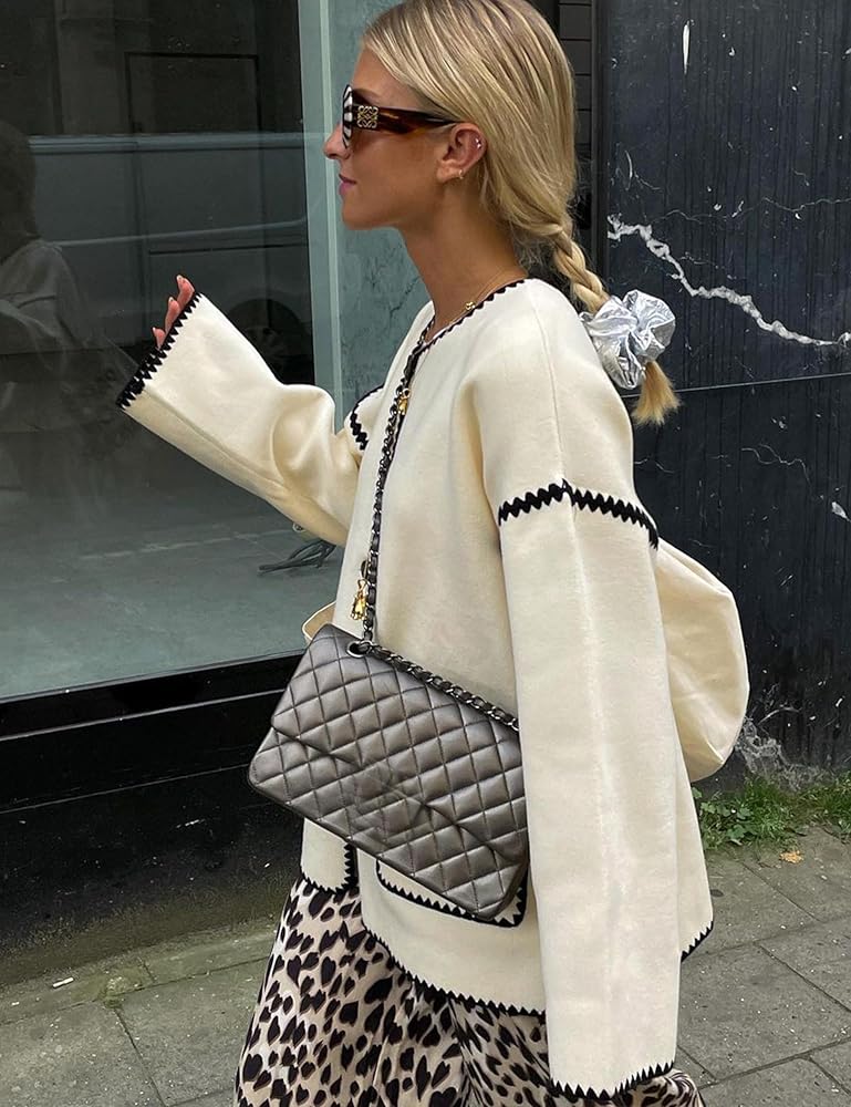 Trendy fall cardigan outwear, round neck, drop shoulder, two flat pockets, elegant contrast trim, relaxed fit casual long sleeve coat for women