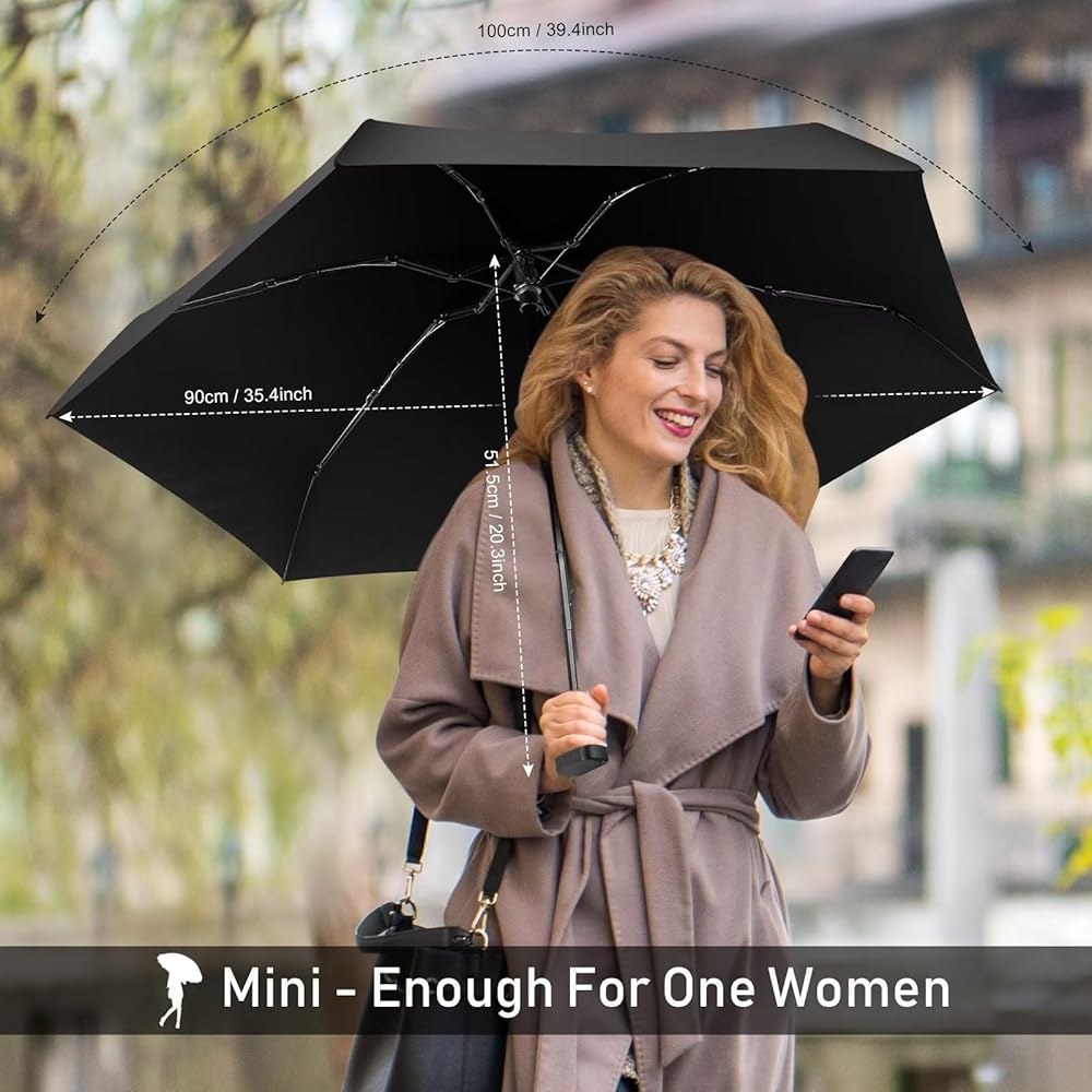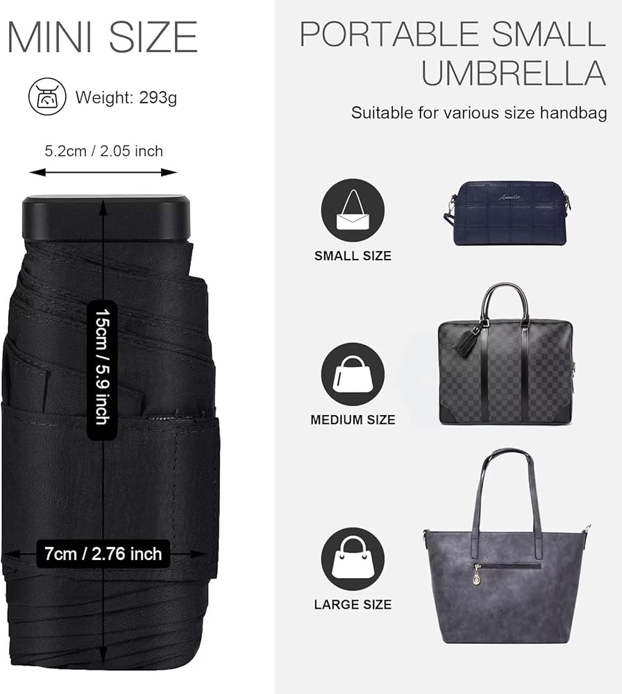 ☂️ Light and Collapsible - Tiny umbrella just 10.3oz and short 5.9 inch, perfectly suitable for your purse, pocket and your handbag. The black color is classic and versatile, and the umbrella's canopy diameter size is 35.4'' just right for one person.