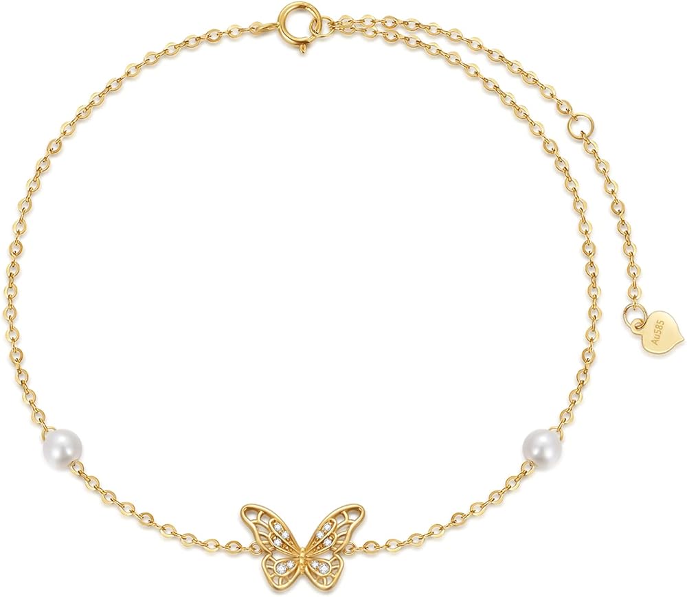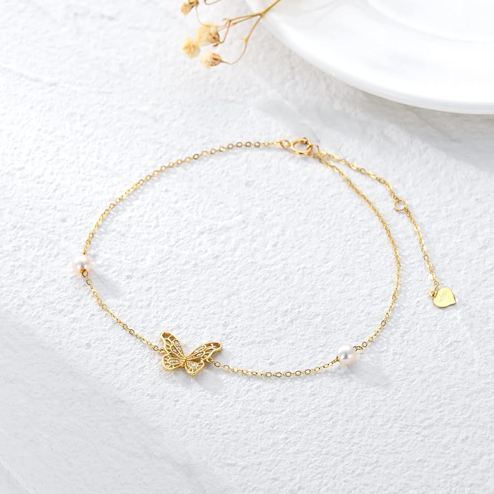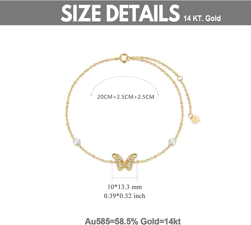 خلخال بتصميم فراشة من الذهب الخالص عيار 14 قيراط للنساء، سوار كاحل مرصع باللؤلؤ الحقيقي، هدايا للنساء، مرصع بالزركونيا المكعب, معدن, مكعب زركونيا