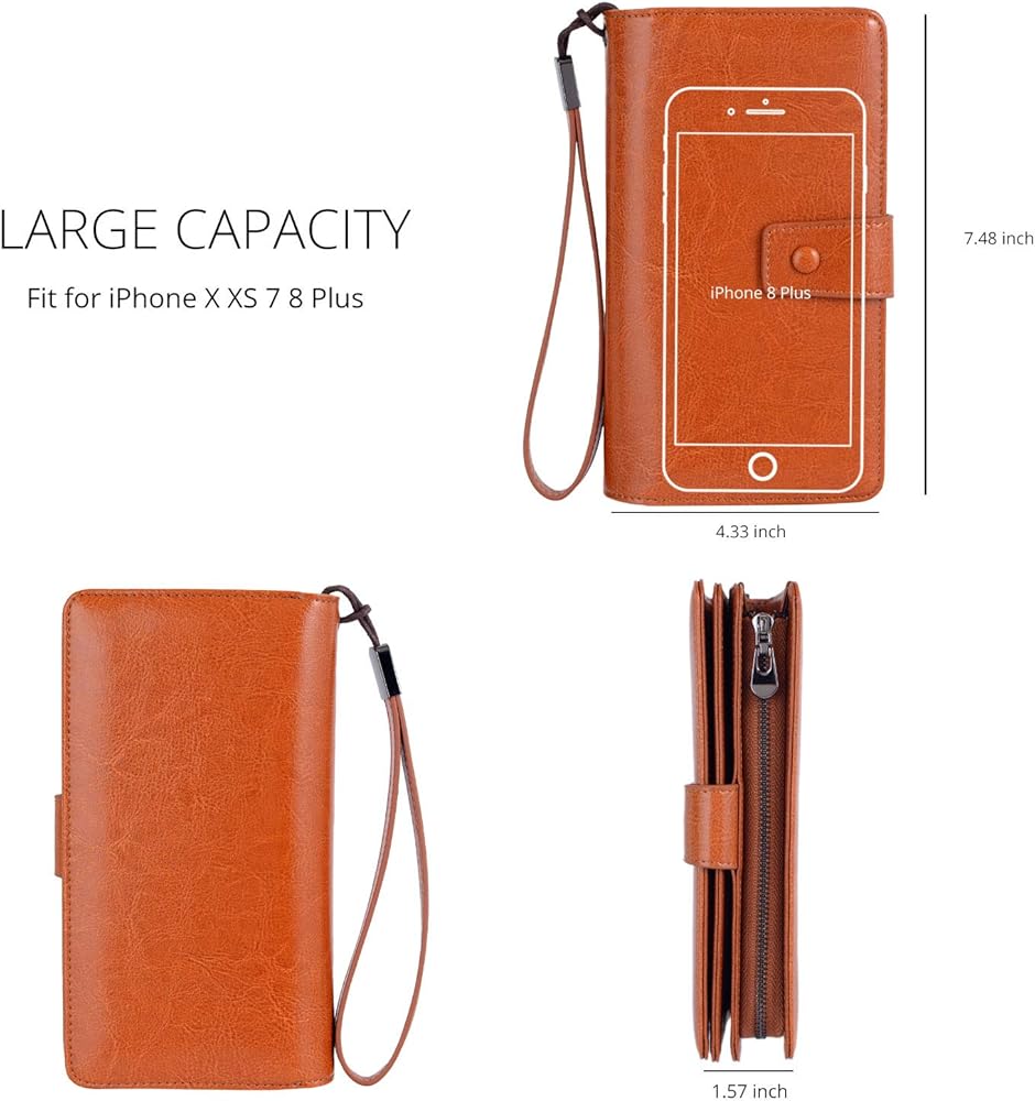 سعة كبيرة: 23 فتحة لبطاقة الائتمان، فتحتان شفافتان لبطاقة الهوية/رخصة القيادة/الصورة، 4 فتحات للإيصالات، 2 جيب كامل للنقود/الفاتورة/الهاتف، وجيب واحد بسحاب للعملات المعدنية. مناسب لهاتف iPhone X XS 7 8 Plus. الأبعاد: 7.48*4.33*1.57 بوصة.