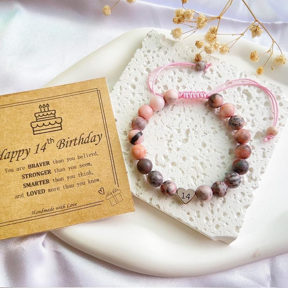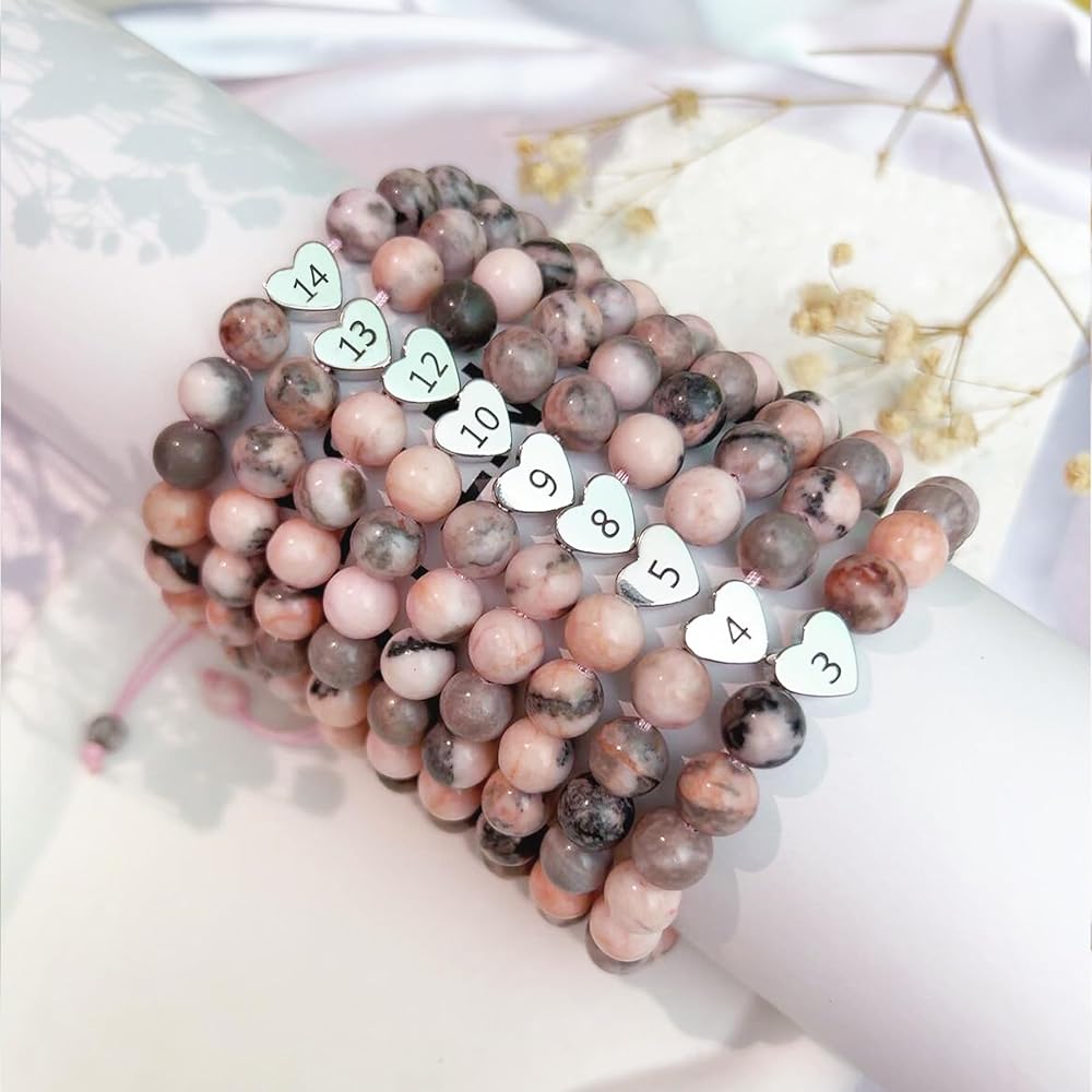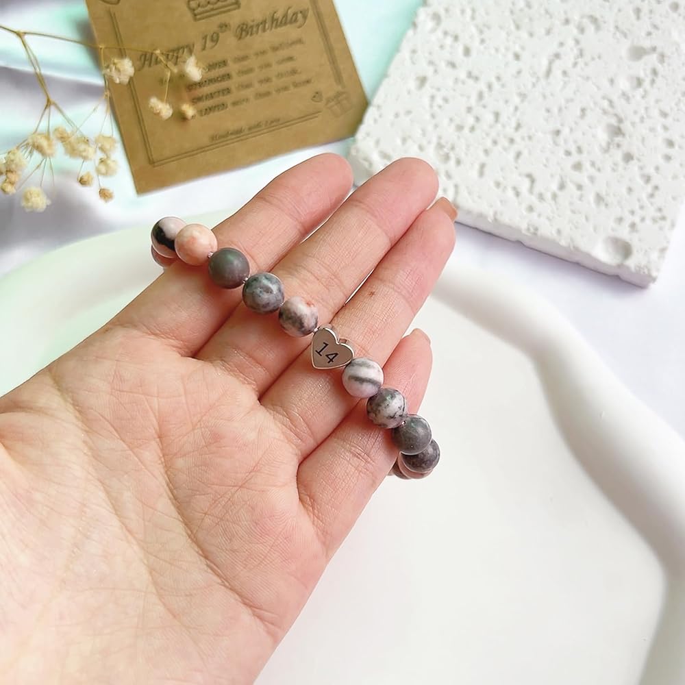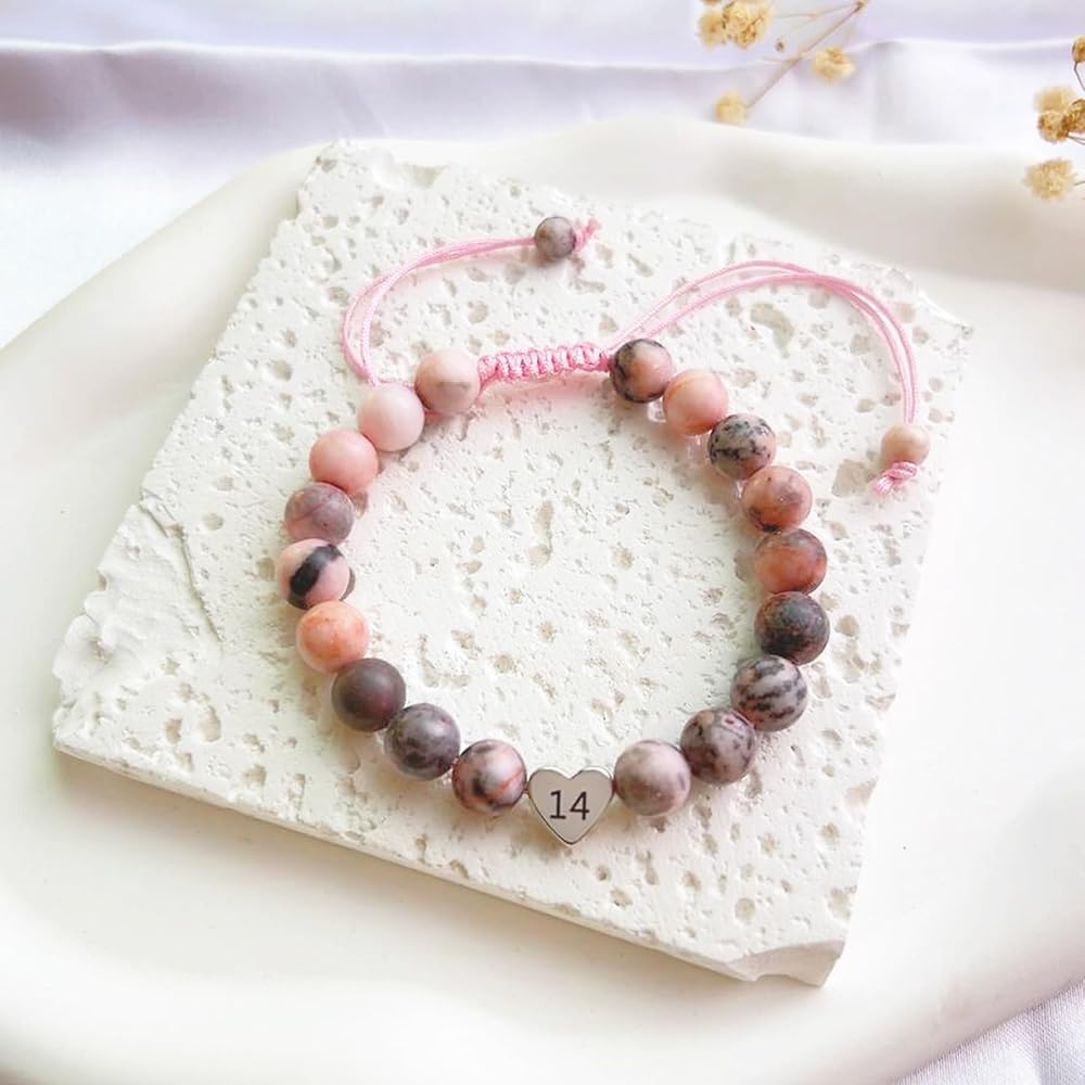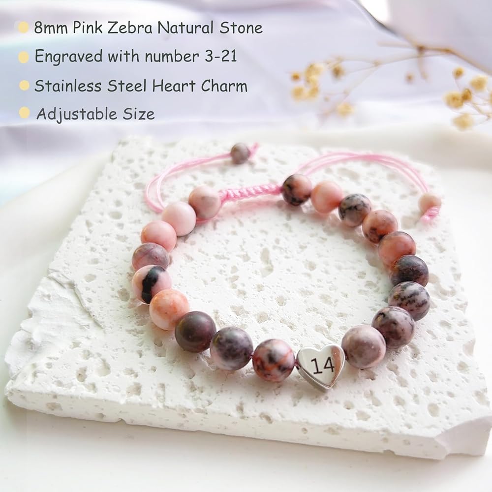 ♥ سوار عيد ميلاد عالي الجودة ♥ سوار ساحر على شكل قلب هدية عيد ميلاد بعمر 21 عامًا للفتيات المراهقات مصنوع من حجر جاسبر الحمار الوحشي الوردي الطبيعي مقاس 23 مم وحلية قلب من الفولاذ المقاوم للصدأ مع رقم عيد الميلاد، كما يساعد الحجر الطبيعي على تخفيف التوتر. لا يسبب الحساسية وخالي من الرصاص والنيكل، وآمن للبشرة الحساسة ومريح للارتداء اليومي.