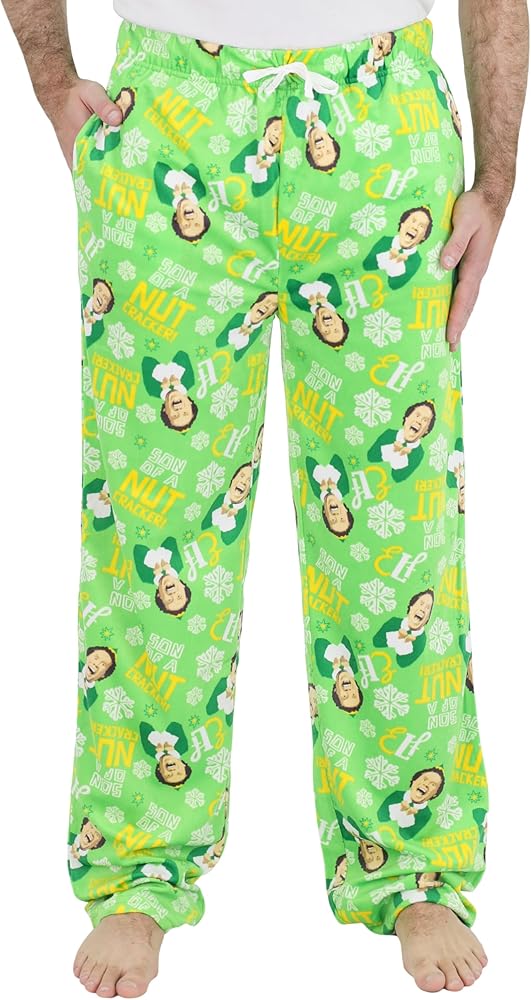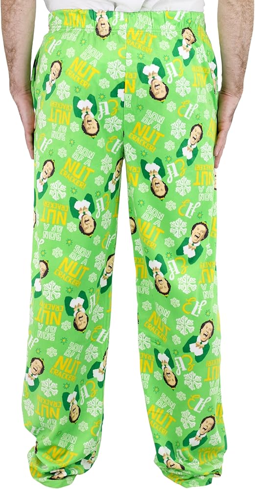 These pajama pants feature Buddy the Elf inspired all-over prints with candy canes, snowflakes, peppermints and "Son of a Nut Cracker!" text