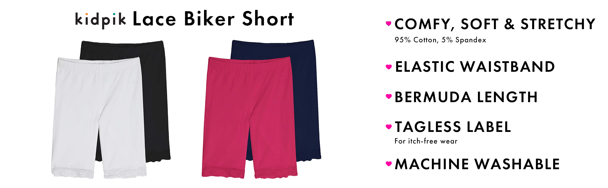 Your girl can wear these bike shorts under her favorite skirts and dresses as the trim detail adds a feminine finishing touch.