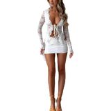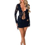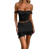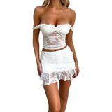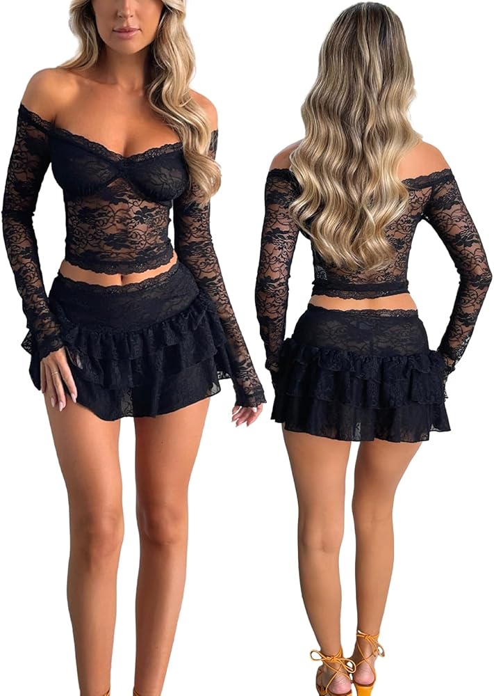 Women Lace Skirt Set Fairycore See Through Off Shoulder Long Sleeve Crop Tops and Mini Skirt Suit 2 Piece Outfits Streetwear
