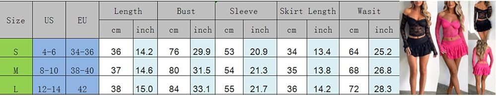 S Tops Length: 14.17 Bust: 29.92 Skirt Length: 13.39 Waist: 24.41 Sleeve: 20.87