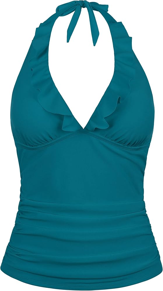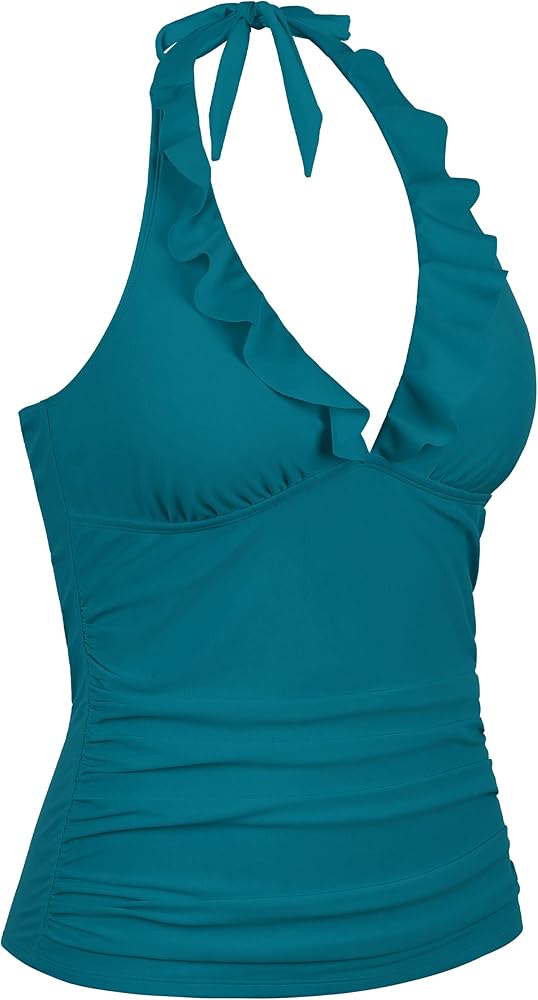womens ruffled tankini top made of quality nylon fabric, stretch, soft, durable, breathable and comfortable for summer beach time, not see-through, stylish halter swim tops for women