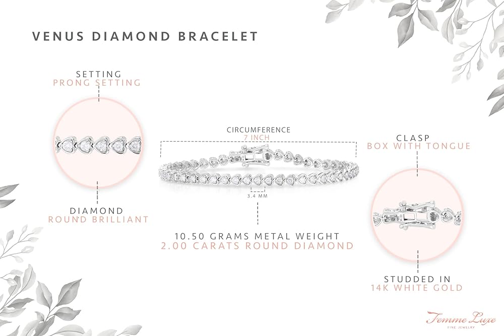 • ✂ أجود المواد جودة: مصمم بالألماس عيار 2.00 قيراط (اللون: G-H، النقاء: I2) ولا يسبب الحساسية، خالٍ من النيكل عيار 14 قيراط. وزن المعدن 10.10 جرام. طول السوار 17.78 سم والعرض 3.4 مم. تم قطع كل ماس يدويًا بشكل مثالي من قبل الحرفيين المحترفين لتحقيق أقصى قدر من التألق المبهّر الذي نحبه!