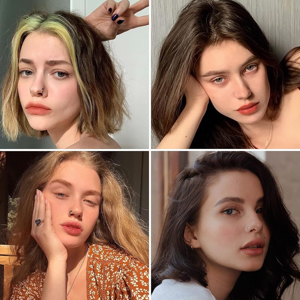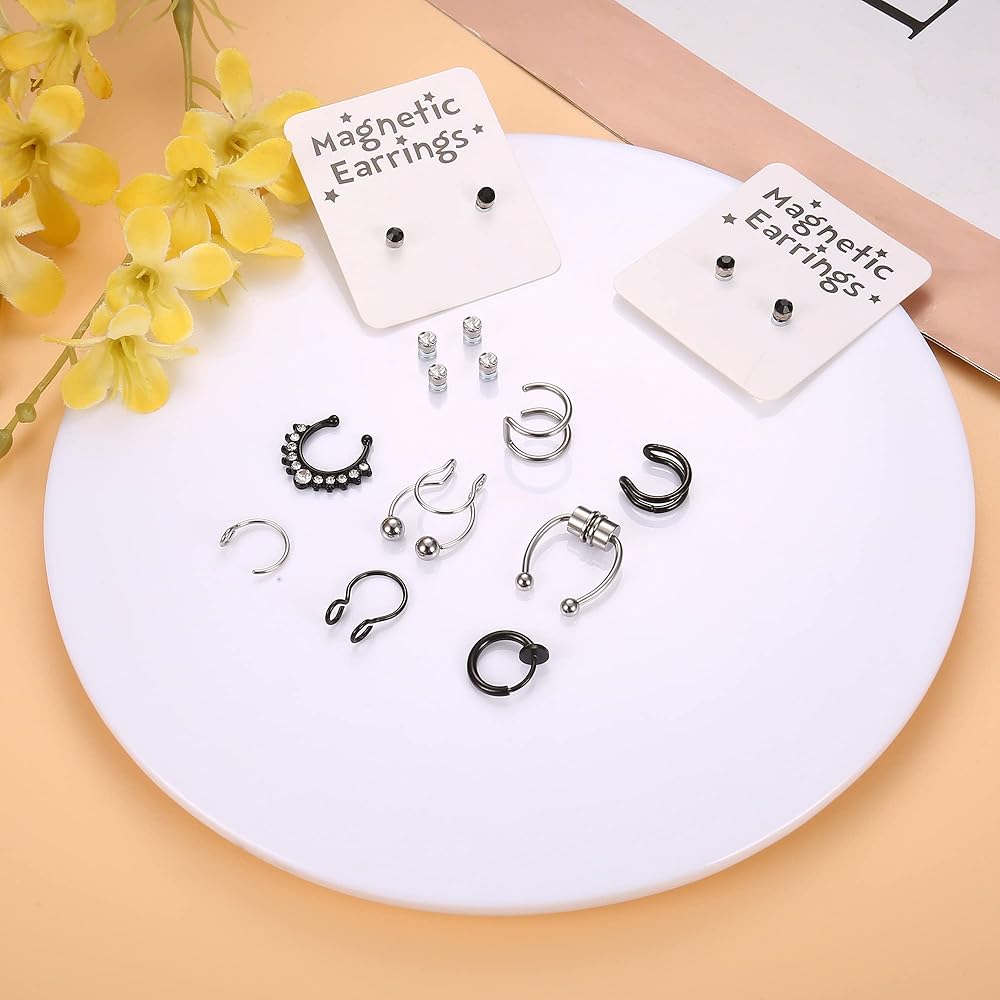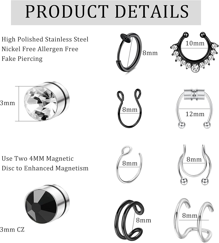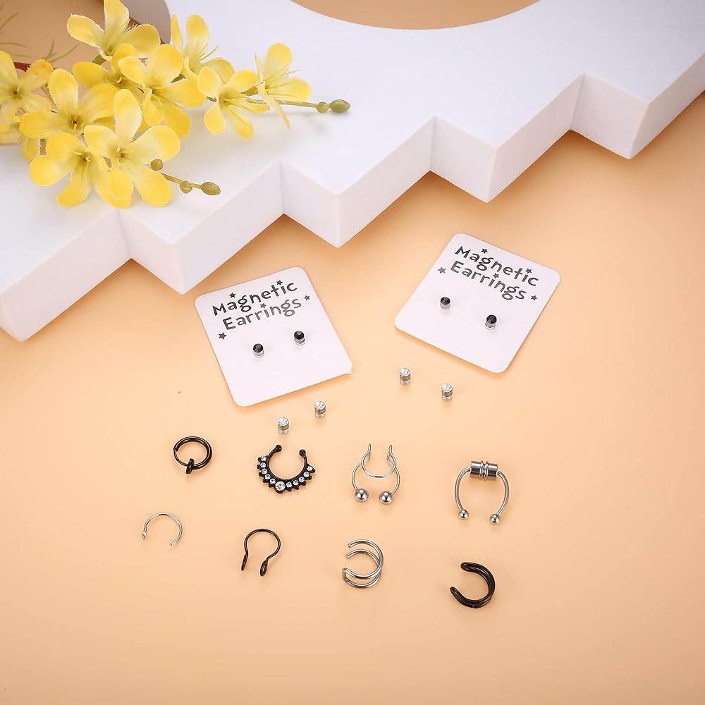 حلقة أنف زائفة متعددة الأنماط: سوف تحصل على 16 حلقة أنف زائفة: 4 أزواج من أزرار الأنف/الشفاه الكروية الزائفة من تشيكوسلوفاكيا و8 حلقات أنف زائفة كلاسيكية أخرى. مجموعة واسعة من الأنماط والألوان ستتناسب مع أي ملابس. مثالية للاستخدام اليومي ارتديها، فهي مريحة في الارتداء ولا تنخلع بسهولة. إذا كنت لا ترغب في وضع فتحة في وجهك، فإن حلقات الأنف هذه هي الخيار الأفضل لك.