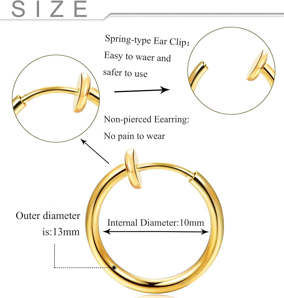 ♥Clip on Nose Ring♥The inner diameter of clip on hoop earrings is 10mm.The perfect size, suitable for both men and women.The clip earring set is designed without piercing. You don't need to pierce real holes in your nose, lips, ears, etc., you can wear it easily..This fake piercing is versatile, you can wear one or more to make yourself more fashionable.