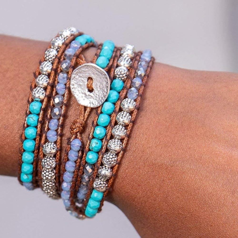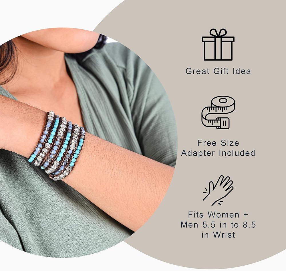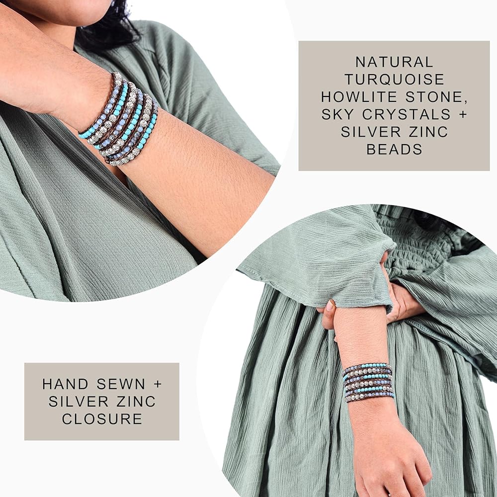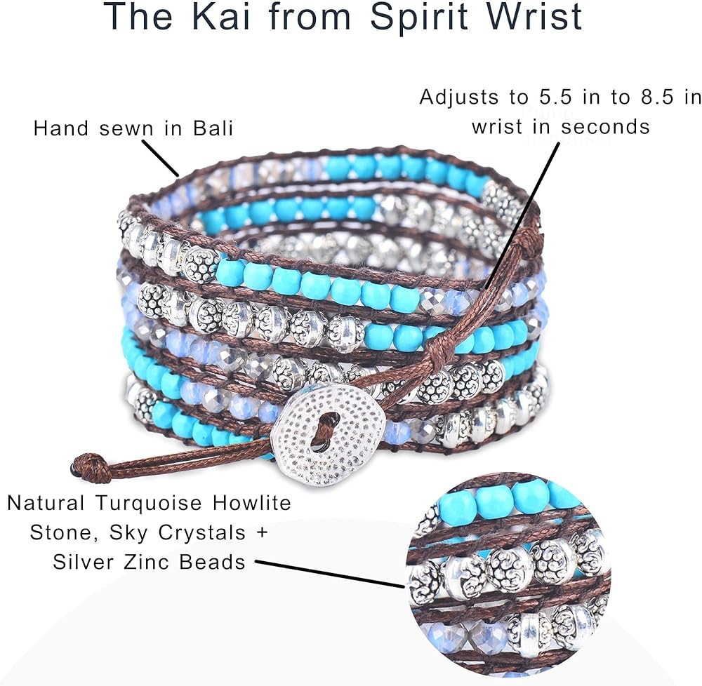 سوار معصم كاي من حجر هاولايت الفيروزي، وكريستالات سماوية، وزنك فضي، وسوار ملفوف بنمط بوهيمي بني مصنوع يدويًا في بالي. أساور المعصم سبيريت مصنوعة من الأحجار الكريمة الطبيعية من أجل سوار مثالي للنساء، مجوهرات السوار الملفوف بالخرز للنساء. تم خياطة سوار كاي بوهو بشكل يدوي مع خرز حجر هاولايت الفيروزي، وكريستالات السماوية، والزنك الفضي وسلك بني بقياس 33 بوصة أو 89 سم. يناسب المعصم من 5 بوصة إلى 8.5 بوصة أو المعصم من 12 سم إلى 22 سم. احصل على مجموعة محولات بمقاس مثالي مجانًا.