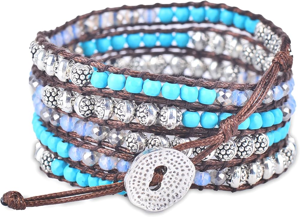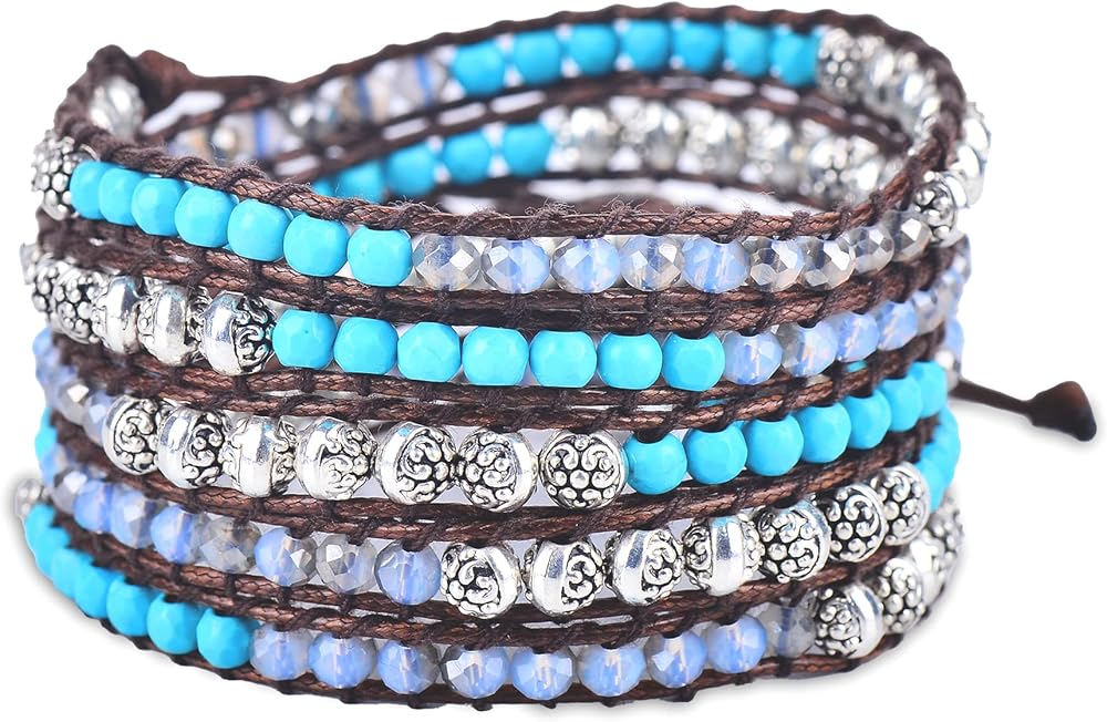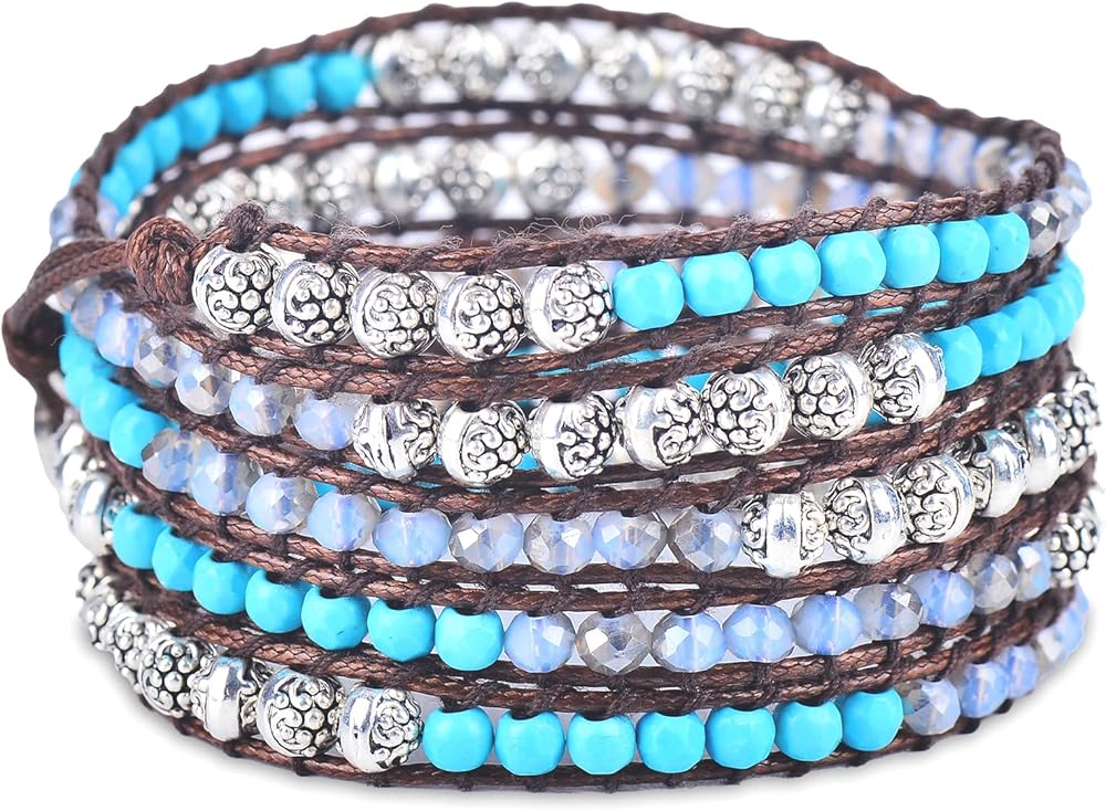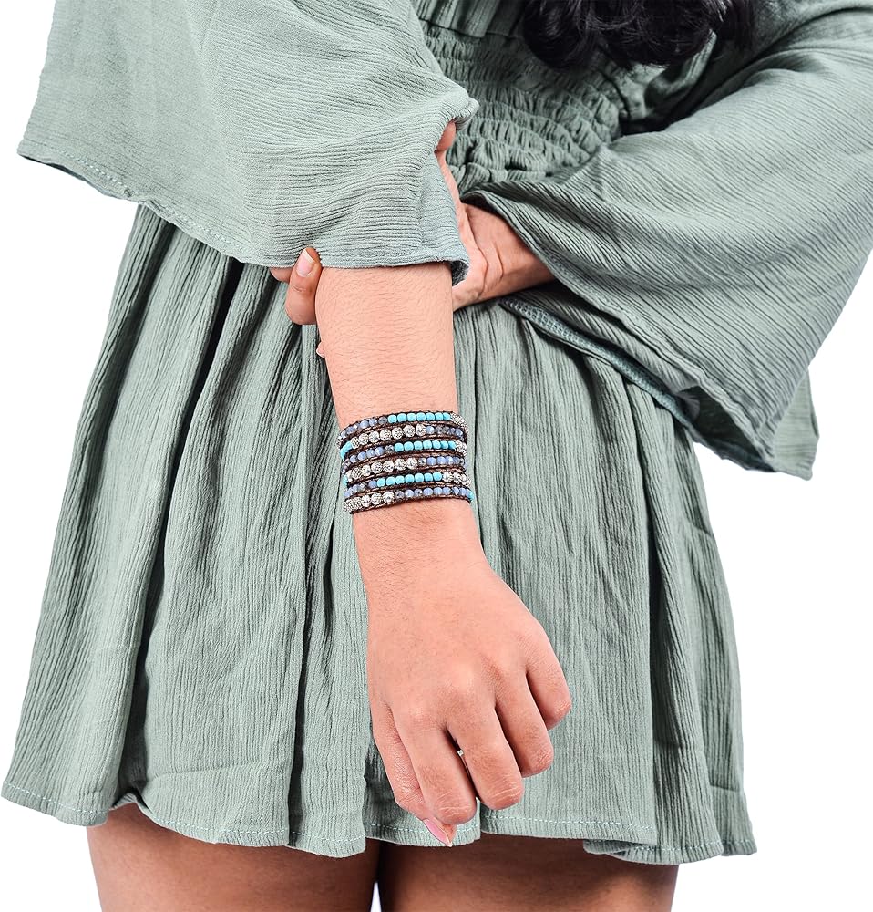 سوار معصم كاي من حجر هاولايت الفيروزي، وكريستالات سماوية، وزنك فضي، وسوار ملفوف بنمط بوهيمي بني مصنوع يدويًا في بالي. أساور المعصم سبيريت مصنوعة من الأحجار الكريمة الطبيعية من أجل سوار مثالي للنساء، مجوهرات السوار الملفوف بالخرز للنساء. تم خياطة سوار كاي بوهو بشكل يدوي مع خرز حجر هاولايت الفيروزي، وكريستالات السماوية، والزنك الفضي وسلك بني بقياس 33 بوصة أو 89 سم. يناسب المعصم من 5 بوصة إلى 8.5 بوصة أو المعصم من 12 سم إلى 22 سم. احصل على مجموعة محولات بمقاس مثالي مجانًا.