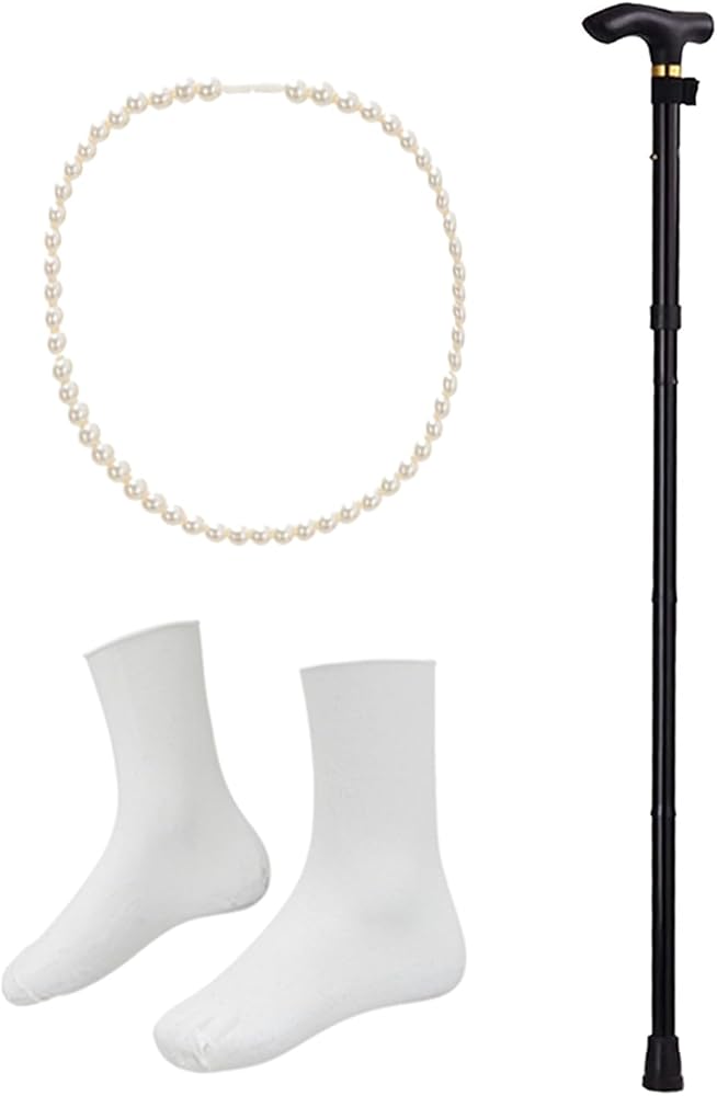 Faux pearl beads necklaces and old lady cane are a great costume accessories addition for a 100th day of school crazy cat lady theme party.