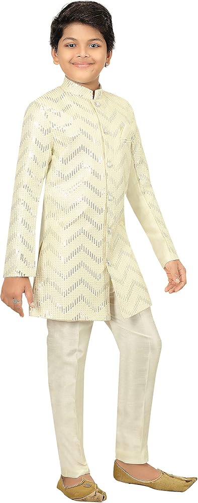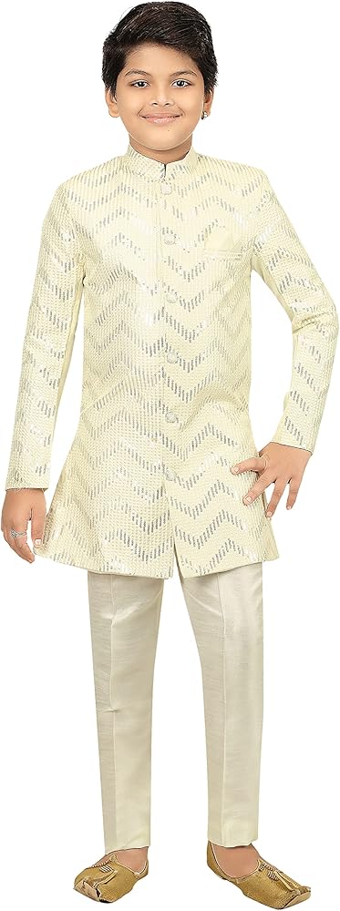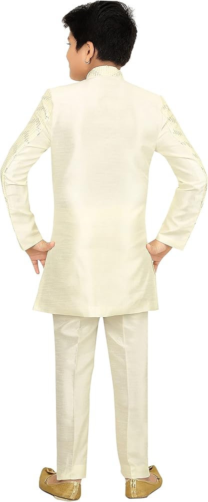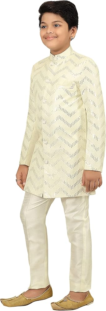 From the house of "Ahhaaaa", the dress consists set of kids boys Zari Work Indo-Western Sherwani set. The boys ethnic wear features an handwork embroidery, banded collar and beautiful button design, The clothes have soft texture and the fit is regular for boys. The party wear dress featuring an eye-catching design. These dresses are available in two different color Cream and Bottle Green. The ethnic wear for special occasion like festive wear, party wear, birthday party and wedding season etc. We select the best fabric and we are specialist in kids wear for boys and girls. Here you can find a wide range of kids clothing in which includes party wear, sherwani, indo western, kurta pyjama, pathani, tuxedo, dhoti kurta, angrakha set and lot more.