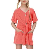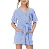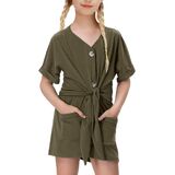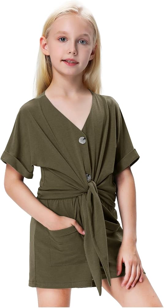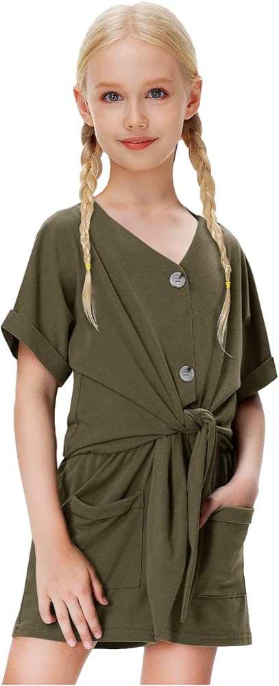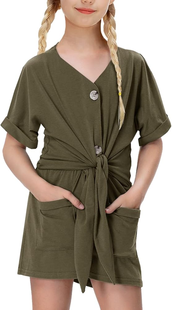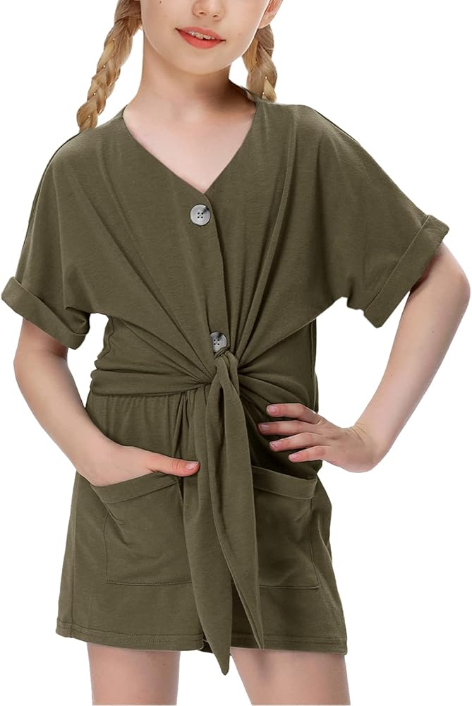 - يتميز رومبير الصيف للفتيات بأكمام قصيرة، ورقبة على شكل حرف V، وأزرار سفلية، وعقدة ربط في الأمام، وخصر مرن، وتصميم سروال قصير بأرجل واسعة.