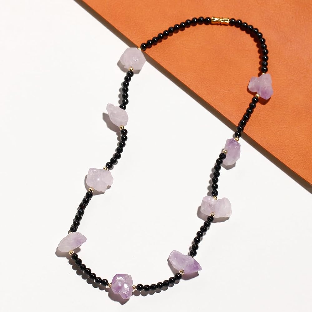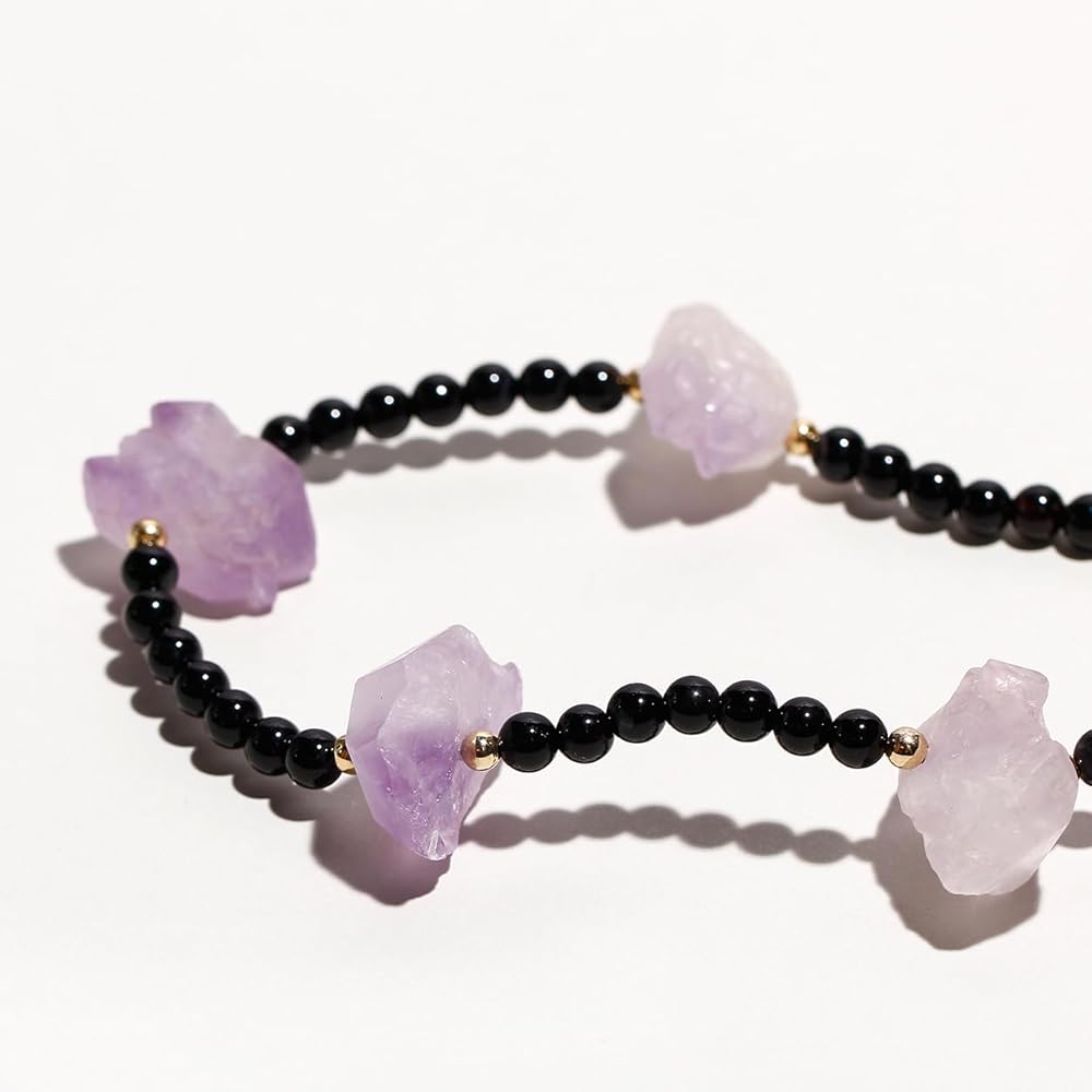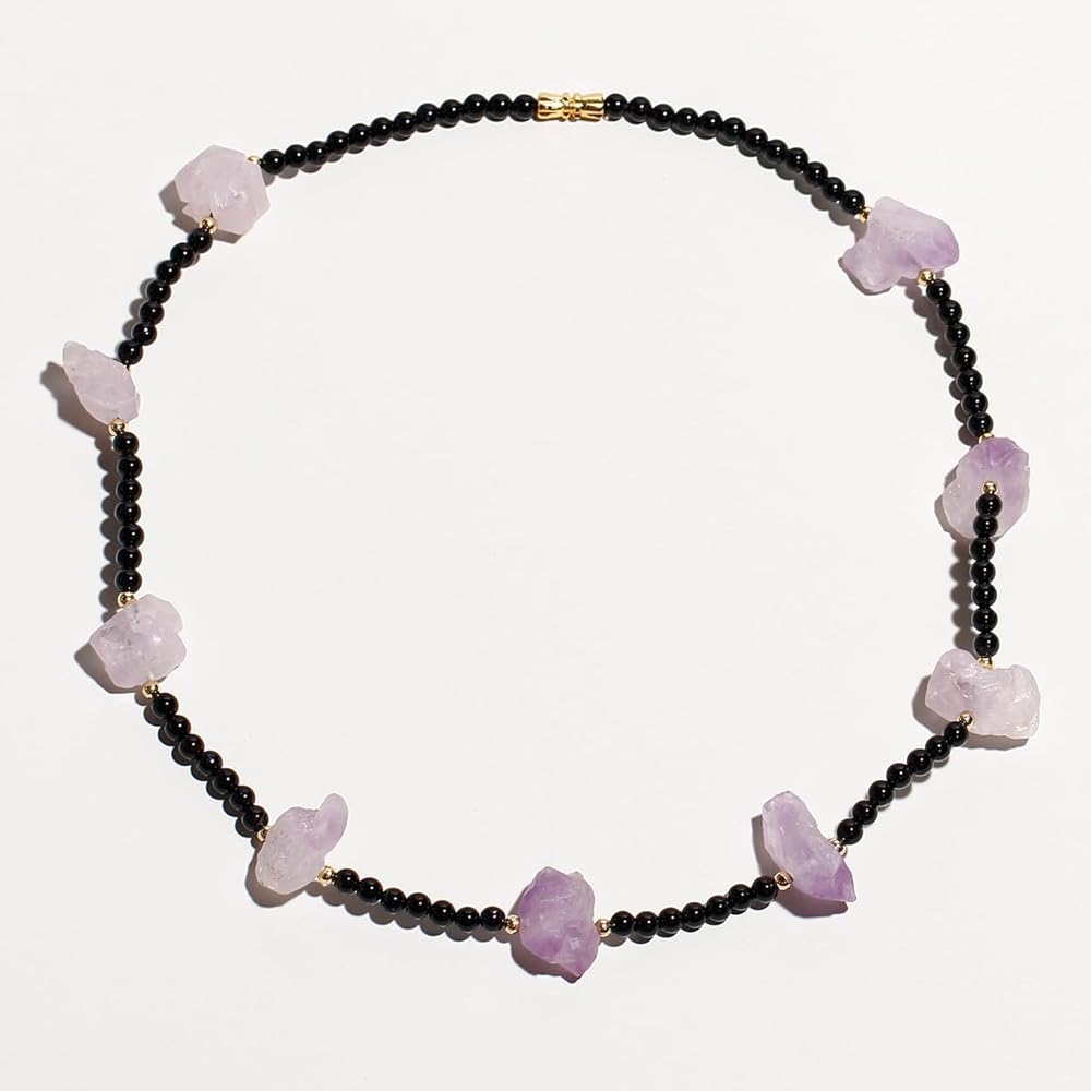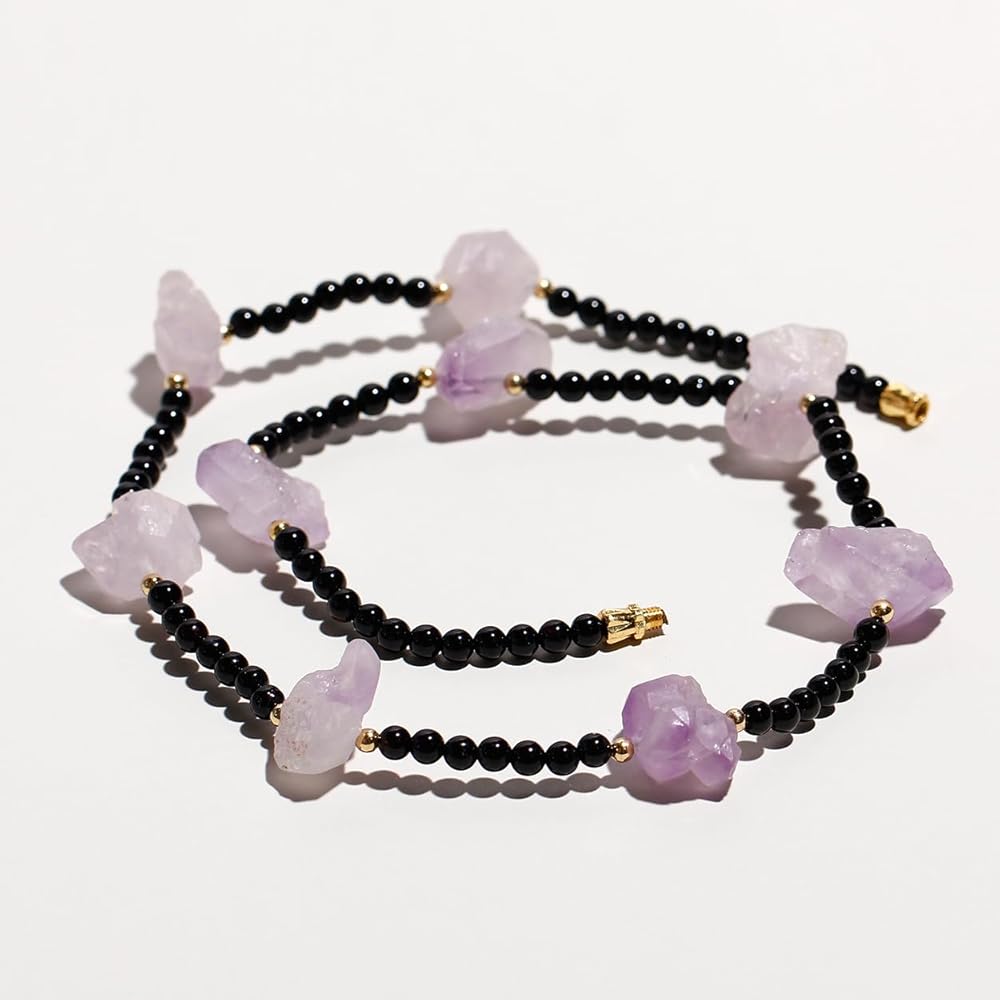 The necklace is made of 4mm black agate and raw amethyst, with a threaded swiveling clasp for easy wearing. Each raw amethyst has a unique shape, color, and size, making each necklace one-of-a-kind.