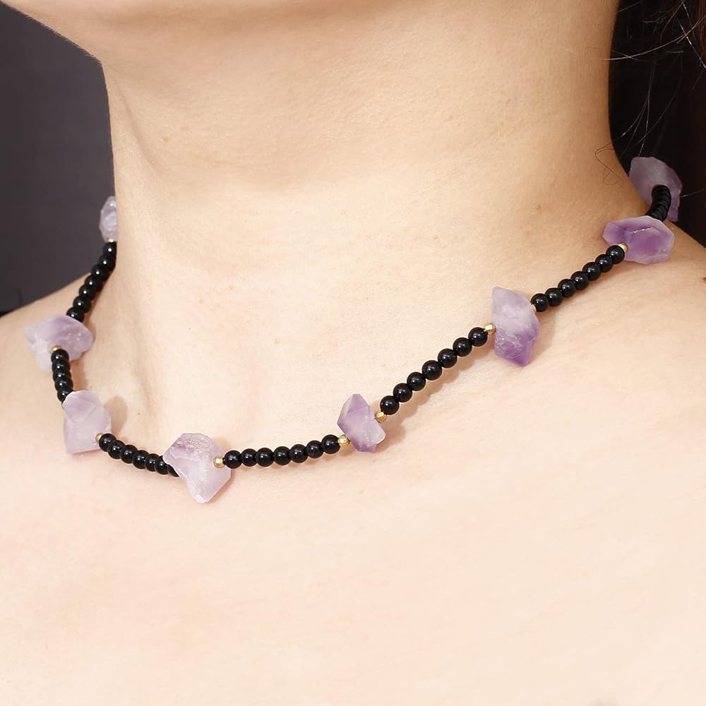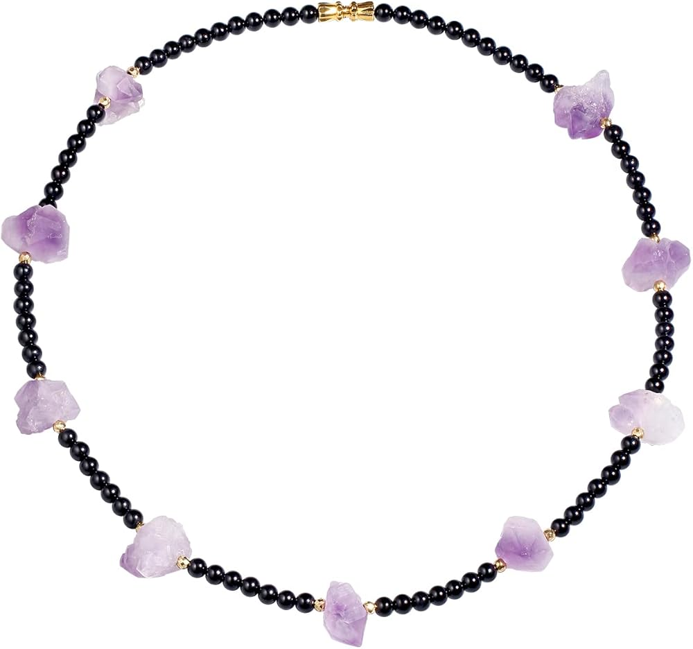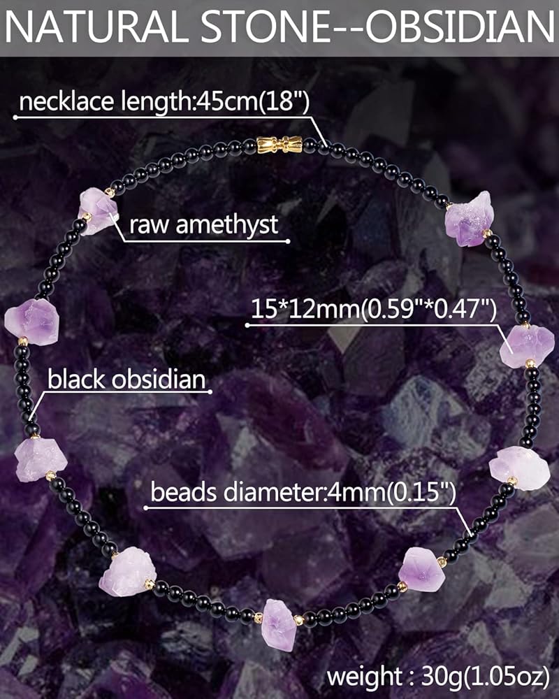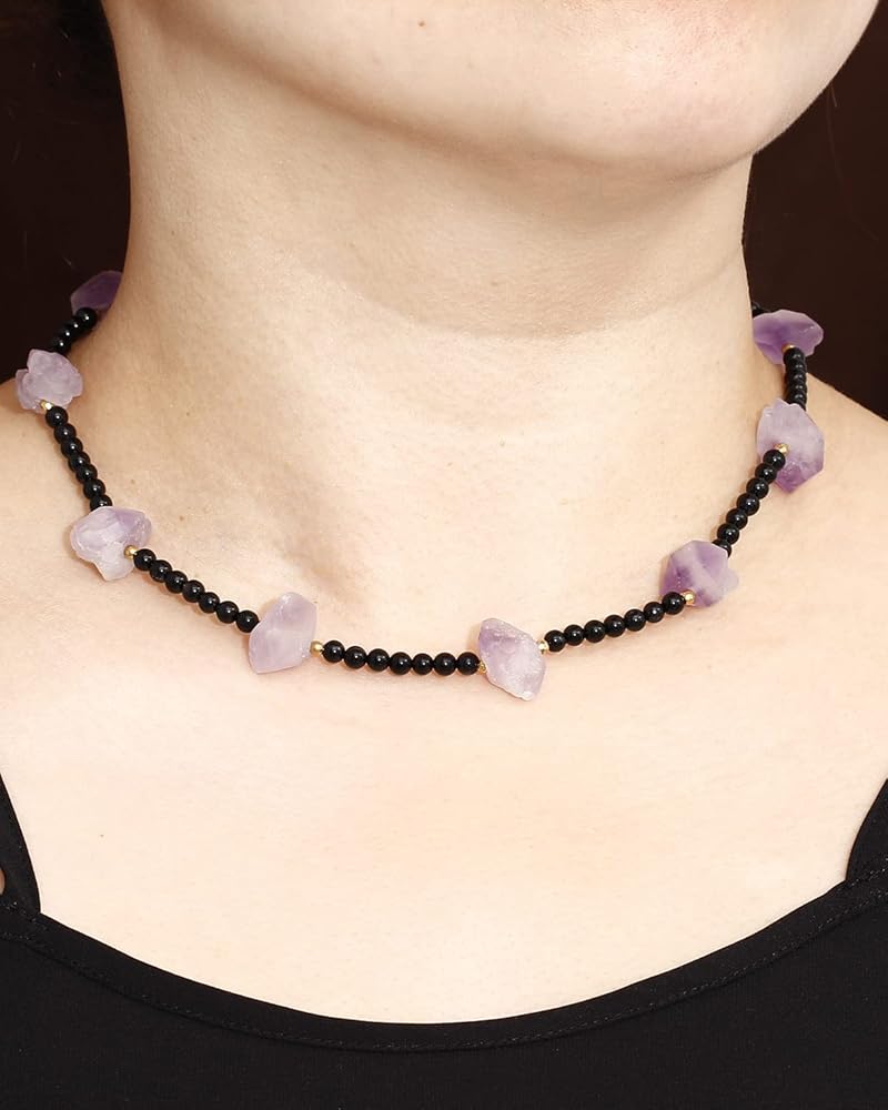 The necklace is made of 4mm black agate and raw amethyst, with a threaded swiveling clasp for easy wearing. Each raw amethyst has a unique shape, color, and size, making each necklace one-of-a-kind.