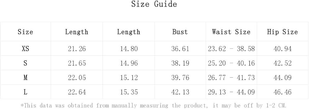 S:Bust:38.2IN,Length:21.7IN,Hip Size:42.5IN,Length:15.0IN,Waist Size:25.2-40.2IN