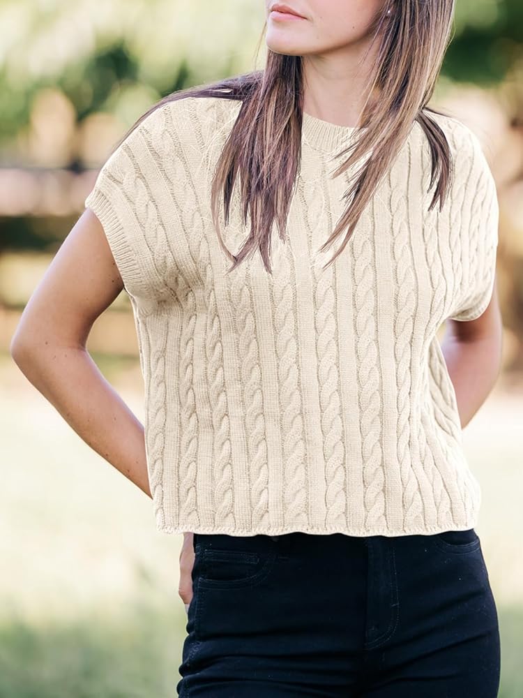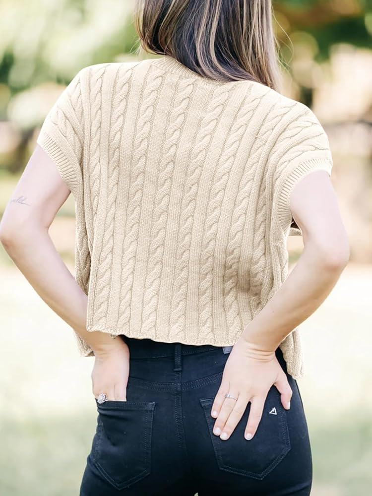 • التصميم: سترة السترة العصرية أنيقة وعصرية: تصميم كلاسيكي منسوج بكابل، كم قصير، رقبة دائرية، نمط كاجوال، مقاس فضفاض، لون سادة سادة. تضيف الخطوط النظيفة والملمس المحبوك لمسة من الذوق العتيق، مما يجعلها مريحة لمجموعة متنوعة من المشاهد.