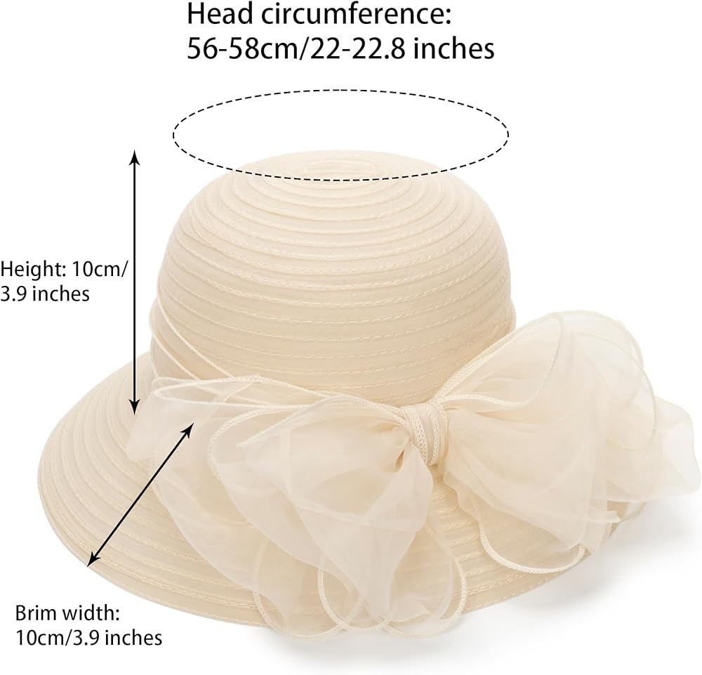 Size for This Wide Brim Hat--- This fascinator Organza Sun hatfor women is suitable for head circumference 22.4 inch~22.8inch, Wide Brim 3.9 inch. Inside sweatband drawstring can adjustable to size-fit to your head.