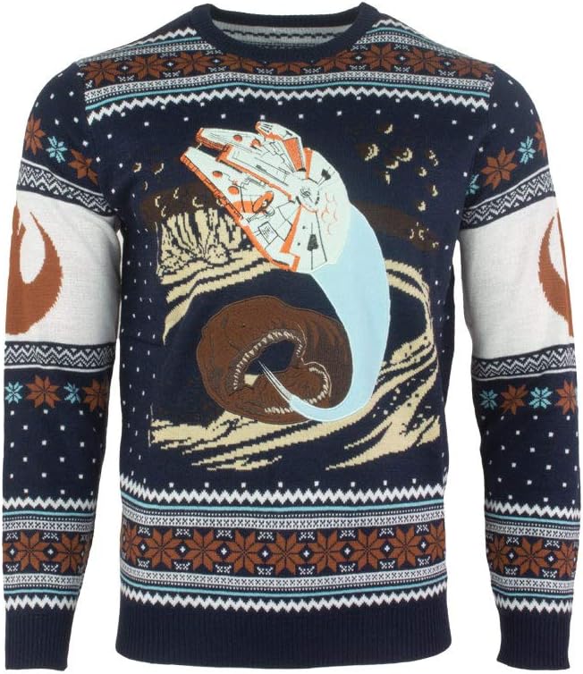 • OFFICIALLY LICENSED STAR WARS APPAREL: Celebrate the world's most iconic sci-fi series with this Xmas jumper, depicting the Exogorth scene with the Millennium Falcon barely avoiding its gaping jaws.