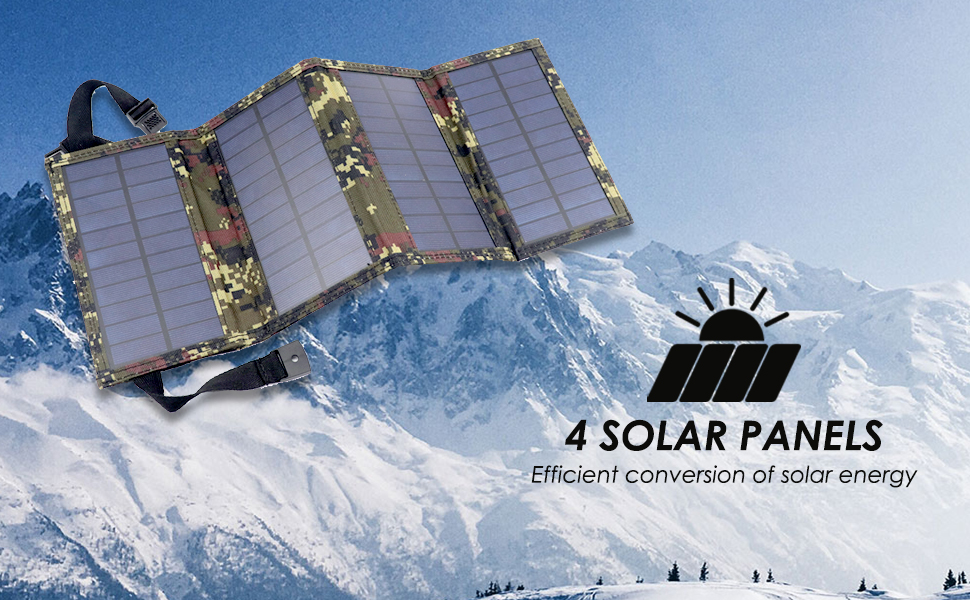 4 ألواح شمسية كبيرة: هذا الشاحن الشمسي مجهز بـ 4 ألواح شمسية عالية الأداء، والتي يمكن أن تصل إلى 8 واط تحت أشعة الشمس المباشرة، ويمكن أن تحافظ على تشغيل الهاتف بشكل طبيعي حتى في الأماكن الخالية من الكهرباء.