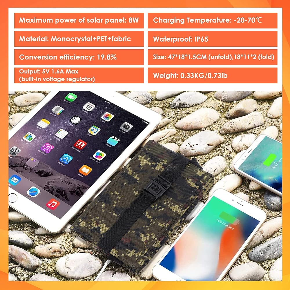 مخرج يو اس بي للشحن السريع: يمكن لشاحن الهاتف الخلوي الشمسي شحن الجهاز بسرعة عالية تبلغ 1.6 امبير. يكتشف تيار الجهاز تلقائيًا ليتوافق مع أفضل مخرج، ويحمي الجهاز من التيار الزائد والشحن الزائد والسخونة الزائدة وقصر الدائرة.
