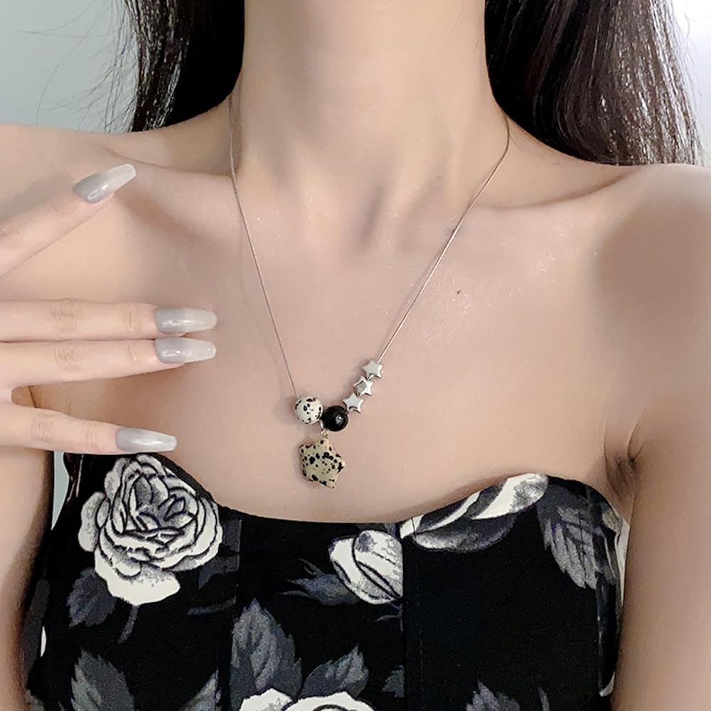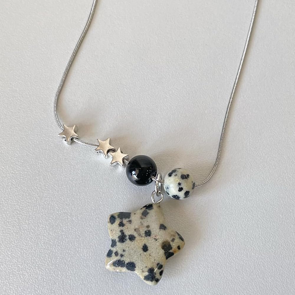 مجموعة قلادات هيبي عالية الجودة: قلادة نجمة للنساء: سلسلة من الستانلس ستيل وخليط معدني ونجمة حجرية. قلادة دوامة: خليط معدني. قوي ومتين، ويمكن استخدامه لفترة طويلة.