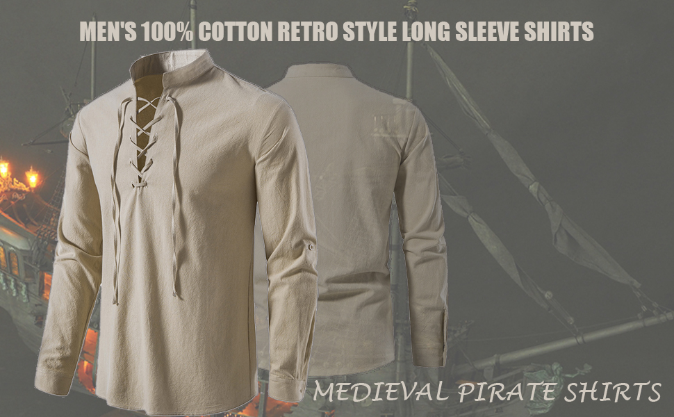 - النمط: قميص قرصان للرجال أو النساء زي القرون الوسطى، قمصان رجالية ذات طراز ريترو بأربطة وأكمام طويلة مناسبة للعصور الوسطى والفايكنج والهيبي