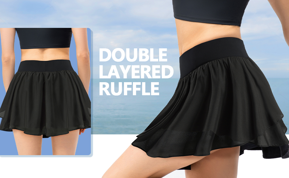 تنورة رياضية مزدوجة الكشكشة: تنورة مكشكشة غير منتظمة مزدوجة الطبقات مريحة وأنيقة مصممة للحركة. يصل طوله الصغير إلى الفخذ مباشرةً، ويأتي مع بطانة داخلية قصيرة مريحة تمنع الضوء من اختراق التنورة بينما تكون أيضًا قابلة للتمدد بما يكفي لتوفير نطاق كامل من الحركة أثناء التدريب.