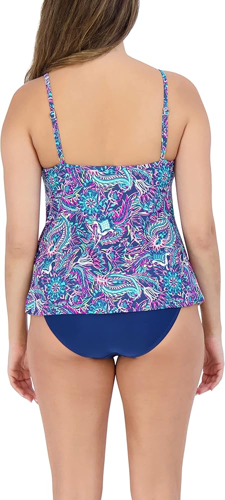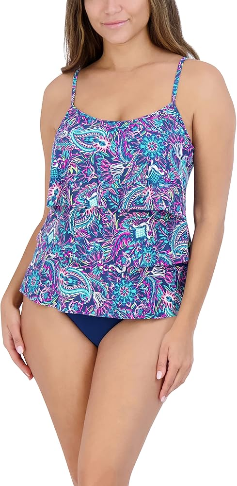TANKINI SWIMSUIT SET: This swimsuit set is perfect for any closet. Fashioned with a stretchy blend, removable cups, tiered ruffles, adjustable straps and roll over bottoms. Hand wash.