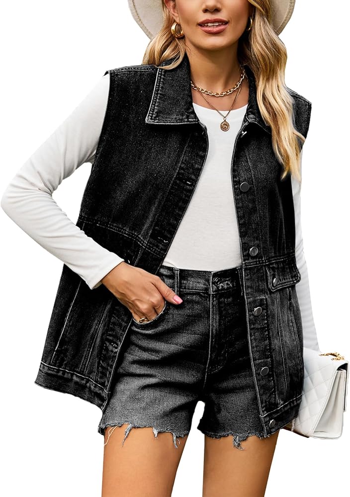 • سترة نسائية من الدنيم بدون أكمام بياقة مطوية لأسفل، بدون أكمام، وجيبين على الصدر وجيبين مائلين لليدين، متوسط ​​الطول لتغطية الوركين.
