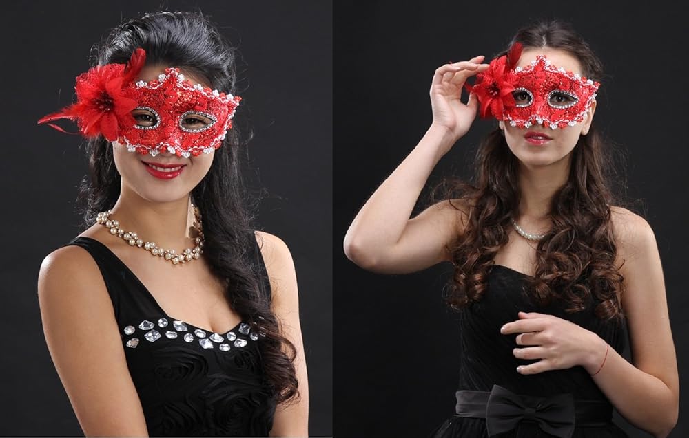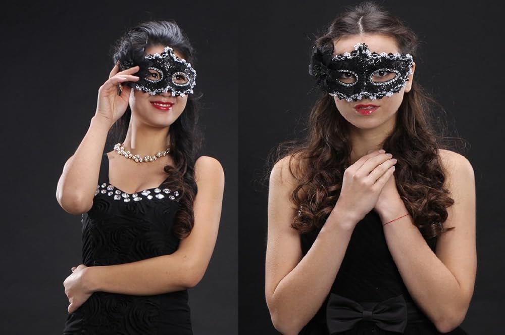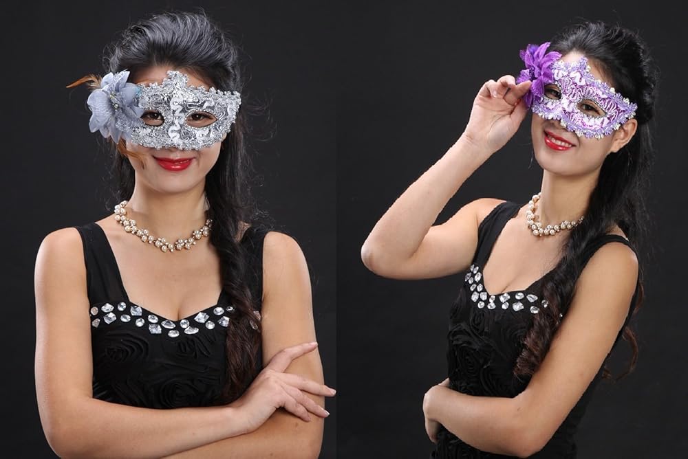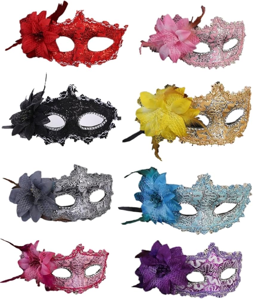 The lot is a set of 8 pcs masks,they are great addition to a variety of costumes and events,such as Halloween costume,masquerade party,or prom.The design is beautiful and elegent,They come with string attacked,so you just tie it behind your head.One size fits most.Package includes 8 pcs masks