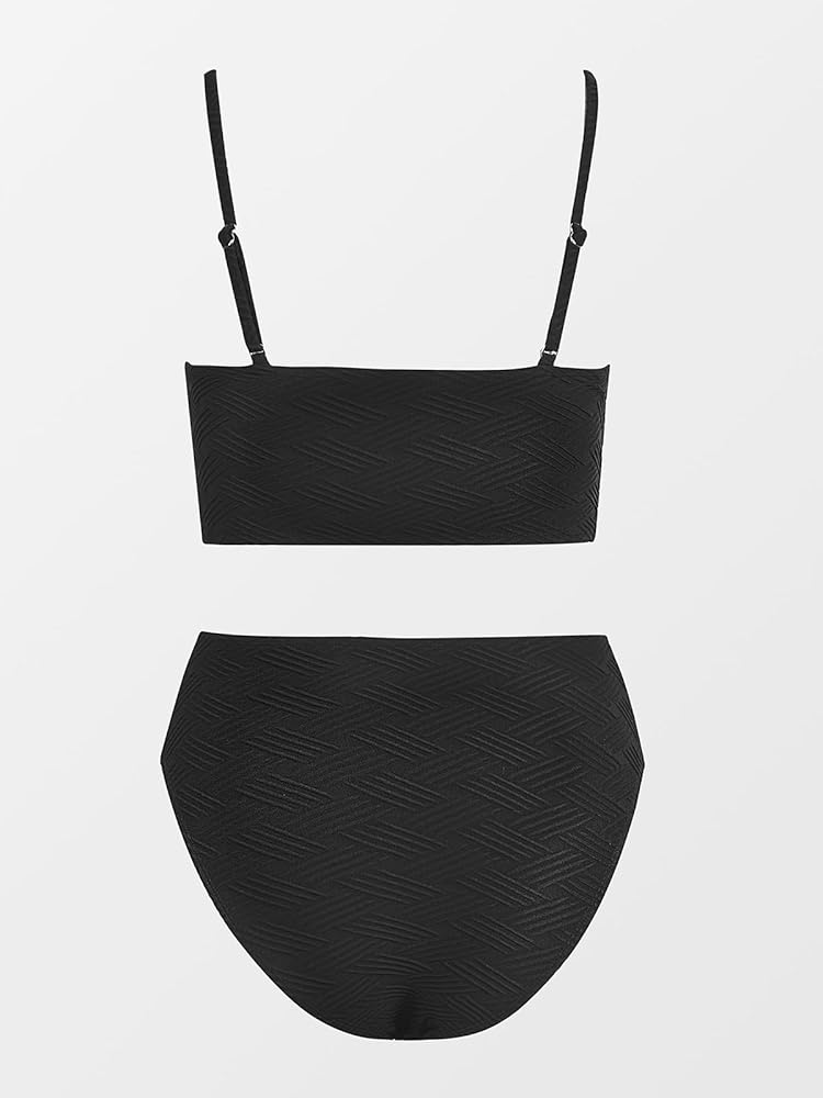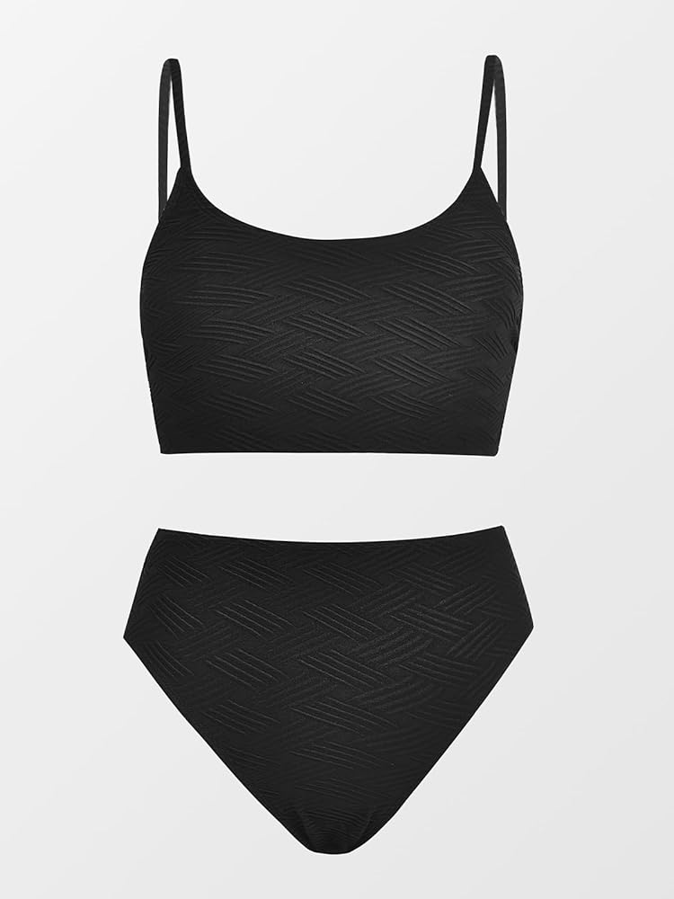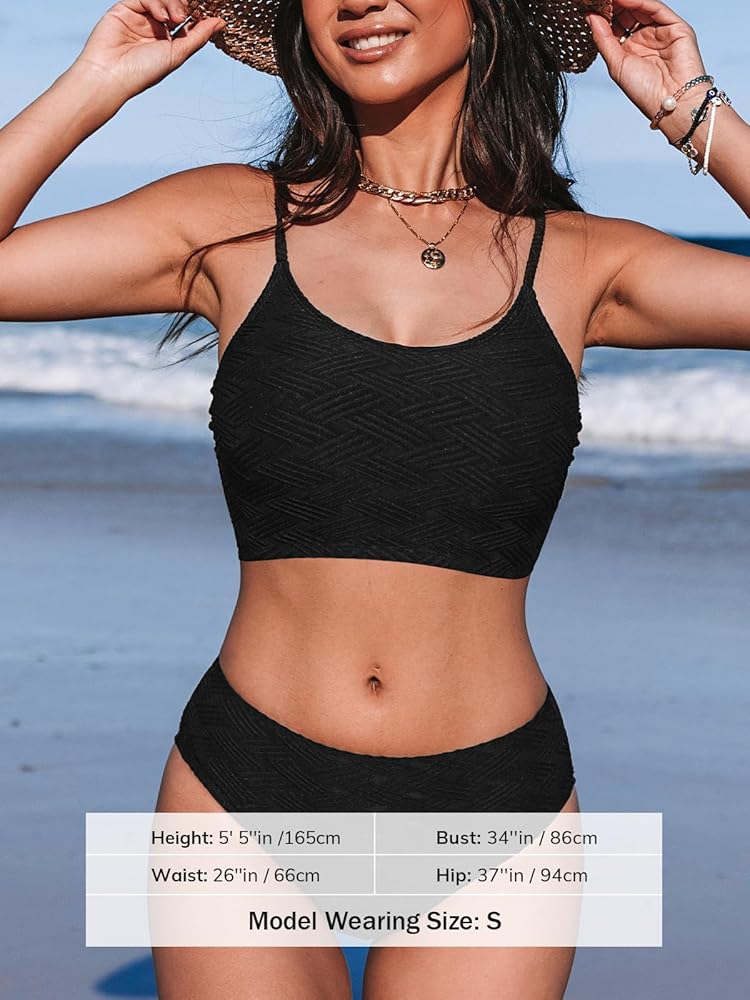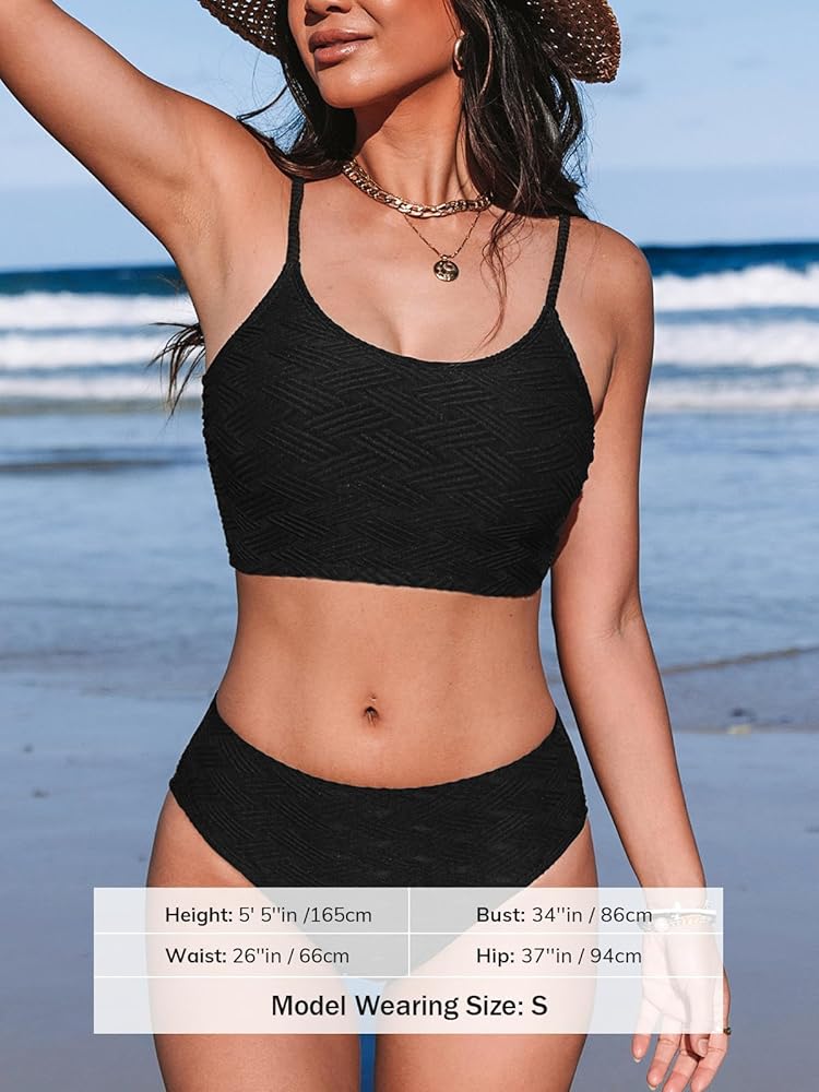 • التصميم: تتميز مجموعات البكيني برقبة واسعة وأشرطة سباغيتي قابلة للتعديل وجزء سفلي متوسط ​​الارتفاع. توفر أحزمة الكتف لمسة رقيقة، بينما يضيف القماش المزخرف العمق والرقي. مع قاع متوسط ​​الارتفاع، يوفر مقاسًا جذابًا عند محيط الخصر، مما يضمن الأناقة والتغطية.