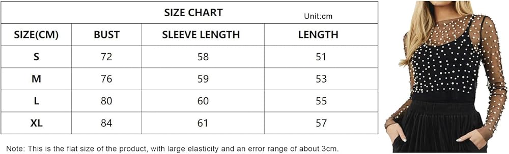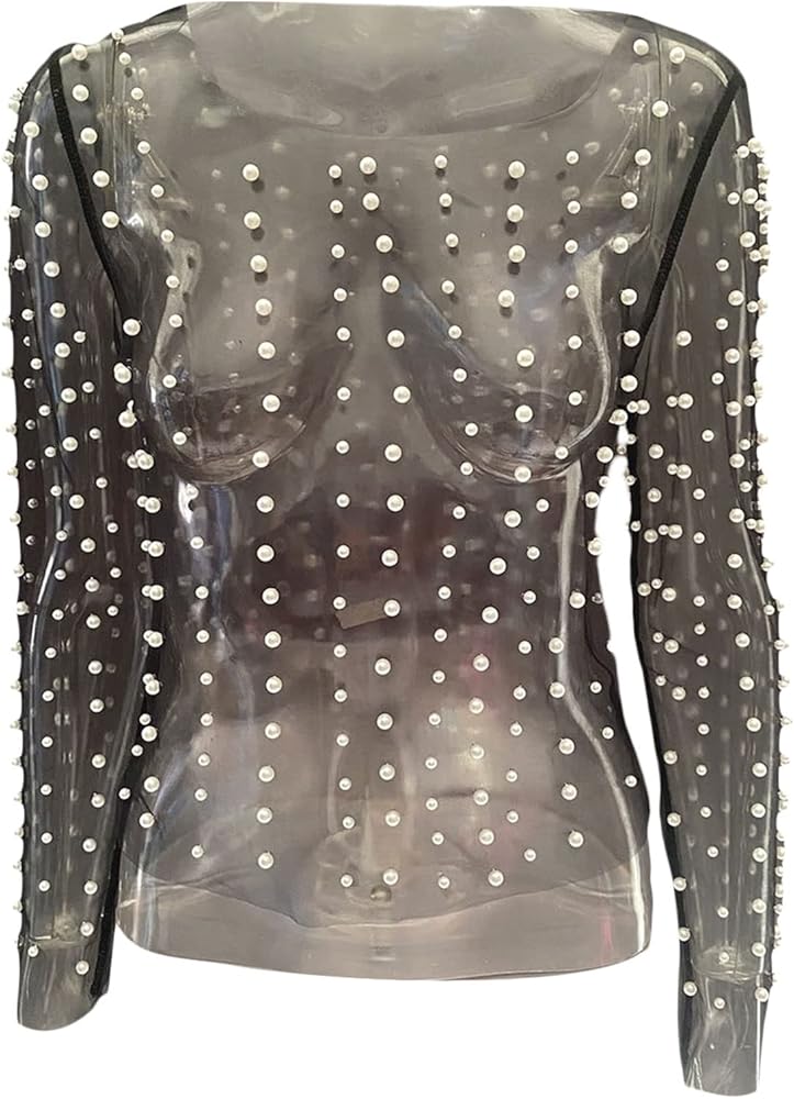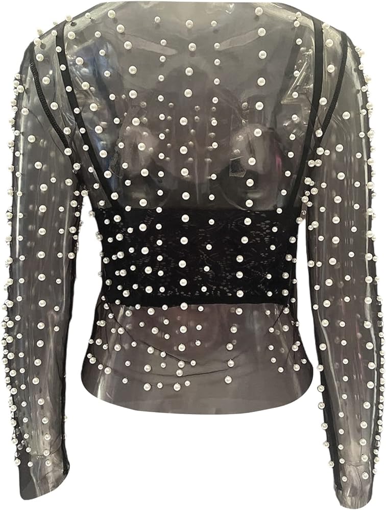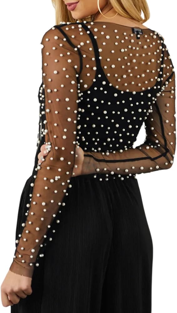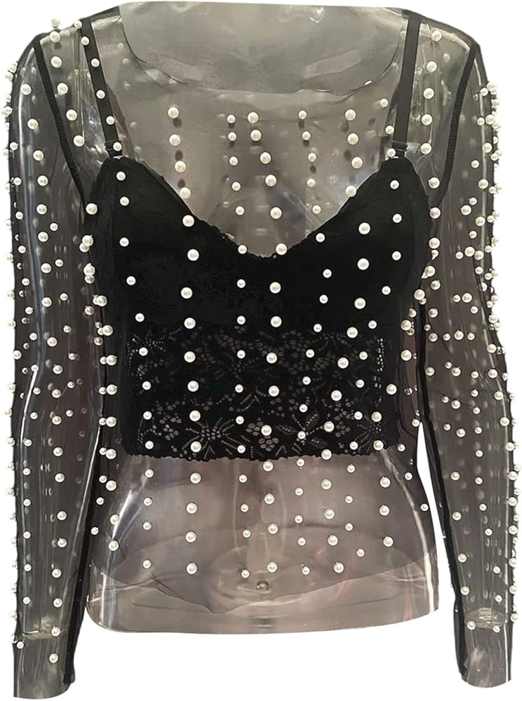 التصميم - قمصان شبكية بأكمام طويلة ورقبة دائرية، تصميم شفاف، مع زخرفة لؤلؤية جميلة، تجعل هذا القميص القصير أكثر تميزًا وجاذبية للأنظار.